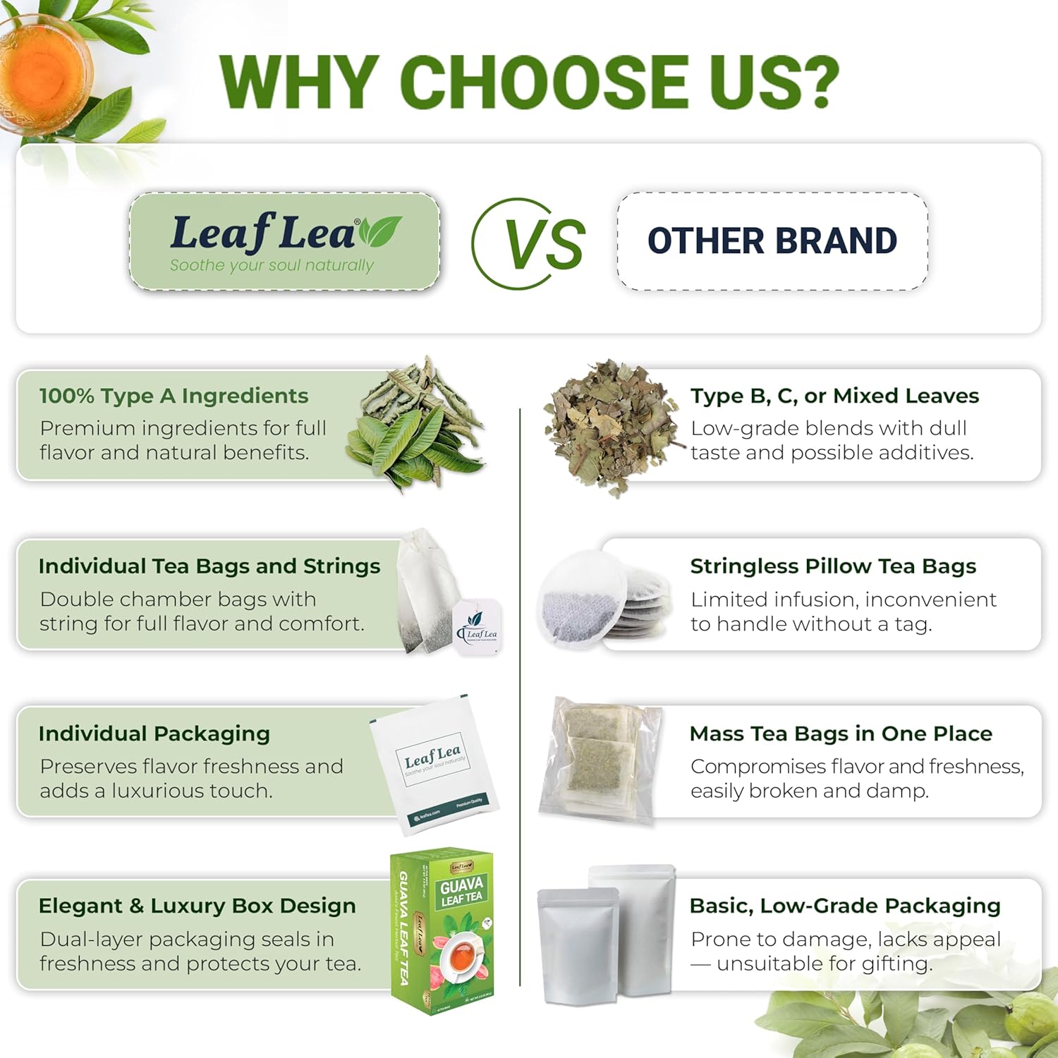 • 100% Pure Guava Leaves – Our LeafLea Guava Leaf Tea Bags are made from carefully handpicked guava leaves, 100% natural and free from artificial additives, sugar, caffeine, and gluten. These guava leaf tea bags are perfect for those looking for a pure and healthy tea experience, offering a natural way to support overall health and wellness.