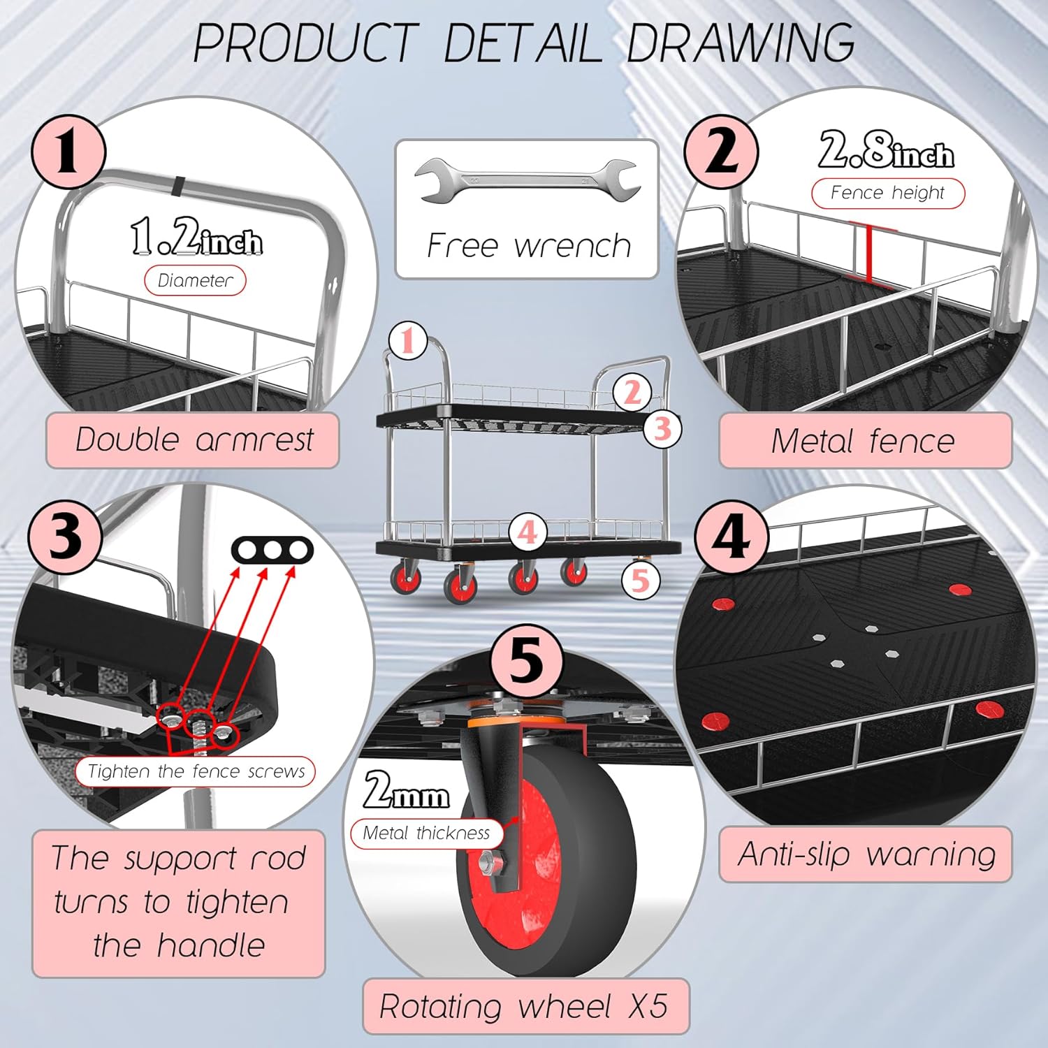 • 【Wider Platform】 Size: 43.3" x 25.5" , gross weight: 58lbs. Heavy-duty utility cart's large platform to load more goods. If you find missing accessories after receiving the goods, please contact us in time, our customer service team will provide you with satisfactory service. Accessories: 5*wheels, 1*small wrench, matching screws