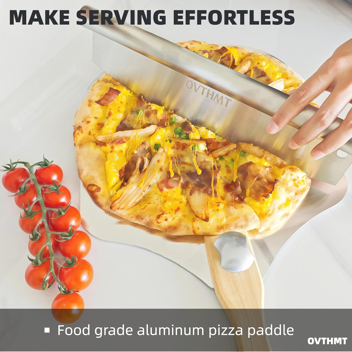 • HEALTHY AND DURABLE METAL PIZZA PEEL: Our pizza peel is made of high quality aluminum. Its size is 12 x 14 inch, and the wooden handle is 11.8 inches long. The pizza paddle features a smooth surface that allows pizzas to slide effortlessly onto pizza stone or pizza oven racks.