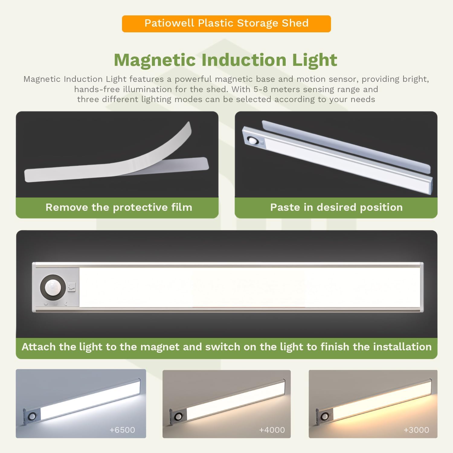 • Magnetic Induction Light: Magnetic Induction Light features a powerful magnetic base and motion sensor, providing bright, hands-free illumination for the shed. With 5-8 meters sensing range and three different lighting modes can be selected according to your needs