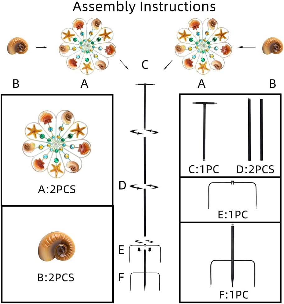 • Ocean Wind Spinner:This windmill adds Marine elements to the design, and the exquisite and realistic conch, starfish and shell are ornamental. As it rotates, it creates a beautiful visual experience in the garden.