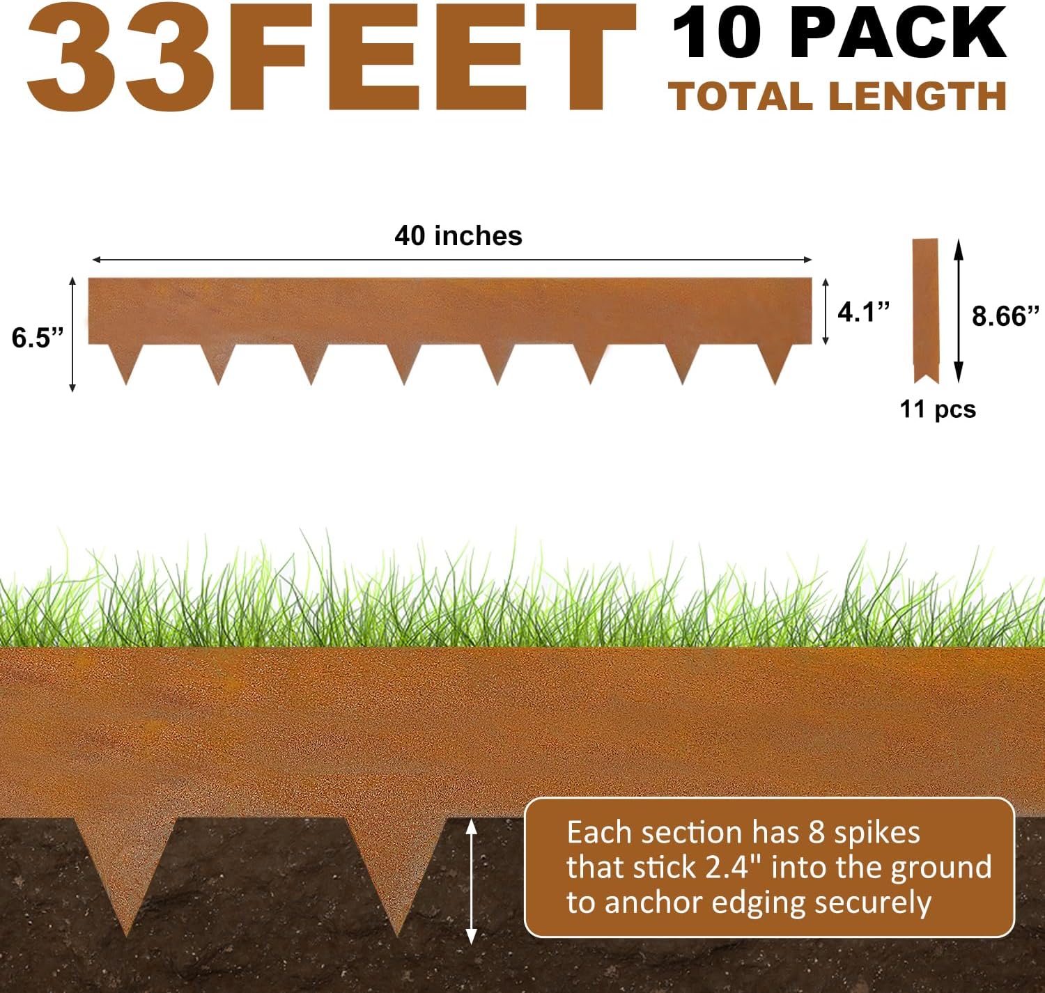 • Package Included: This landscape edging kit includes 10 pieces, each 40 inches long, totaling 33 feet when installed. It comes with 11 pieces of 8.66” clamps to ensure secure connections between edgings. Standing 6.5 inches tall with 4.1 inches above ground, it’s ideal for defining lawns, flower beds, gardens, pathways, and yard borders