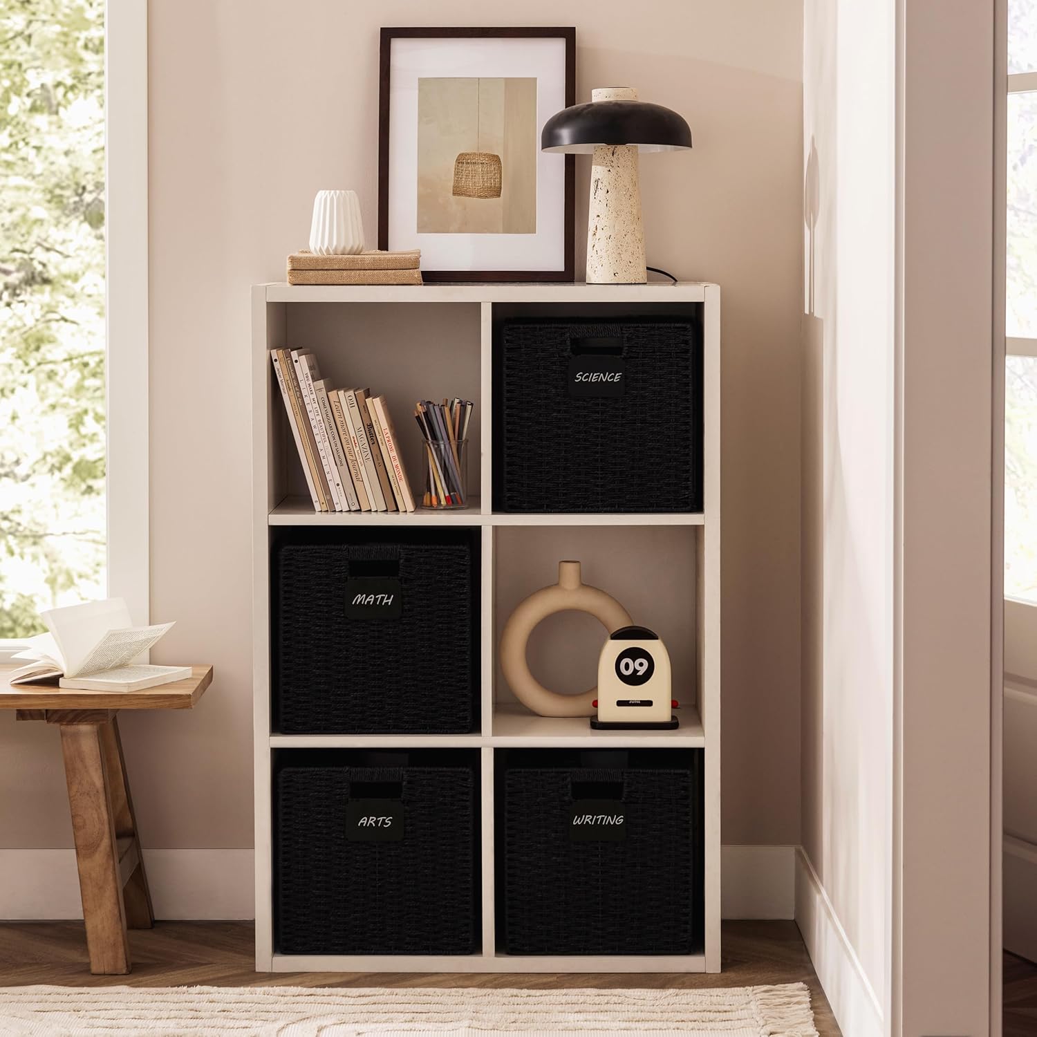 UBBCARE 2 Pack Wicker Basket, 12×12 Storage Cubes with Label, Foldable Cube Storage Bin with Handle, Square Storage Basket for Shelves, Woven Paper Rope Basket for Organizing, Black
