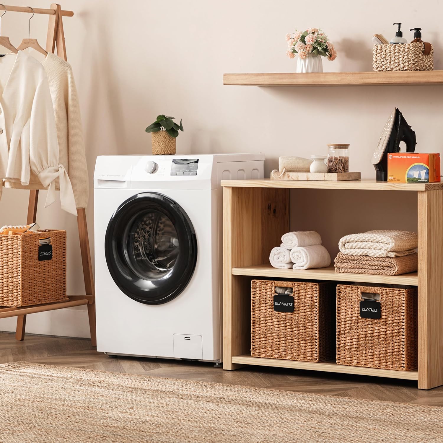 • Easy to assemble: When you receive the package, the wicker storage basket is folded, you just need to open it and put down the bottom board, you will get a perfect wicker baskets. You can fold them completely flat and stack them up against each other to save space when not in use.
