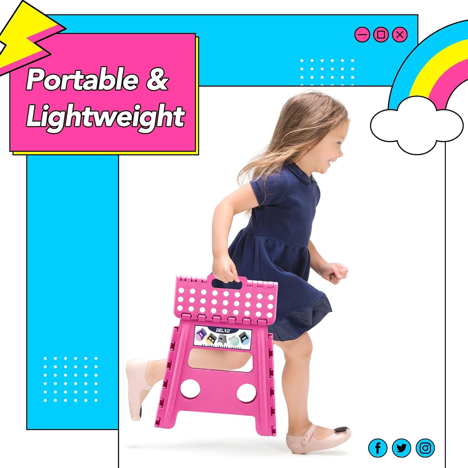 • Collapsible One-Step Stool : The grip-dot textured surface, anti-skid rubber feet design, and smooth rounded edges of this collapsible step stool makes it extra safe for children to use as they are protected from possible bruises that can result from sharp edges. It comes with a handle making it easy to carry around at home or outdoors when needed