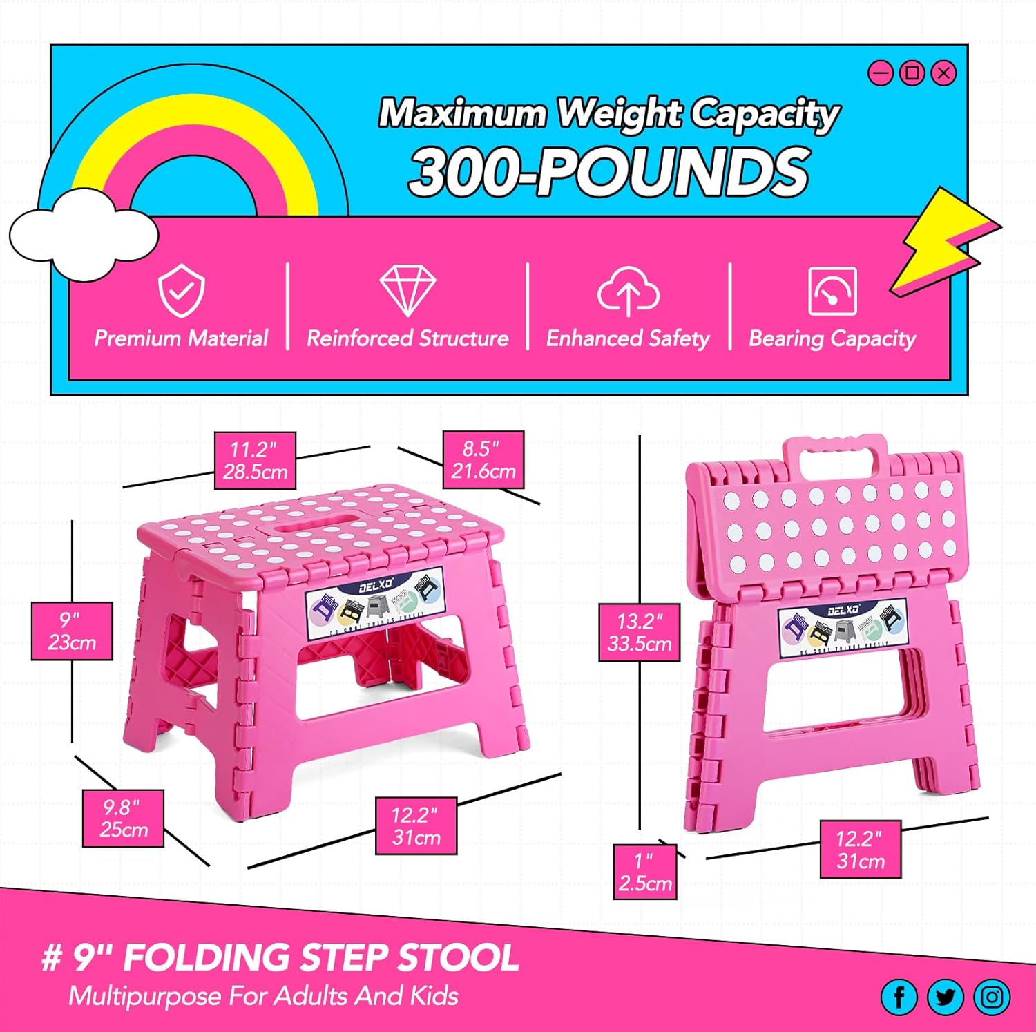 Delxo Folding Step Stool 9 inch Non-Slip Foldable Stools Up to 300 LBS Kids Step Stool with Handle Lightweight for Kitchen, Bathroom, Bedroom, Garden, Rose Pink, 1PC