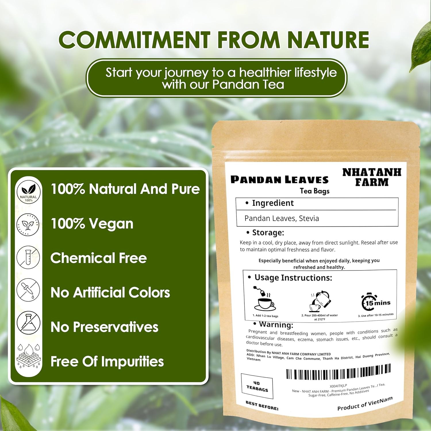 NHAT ANH FARM - Premium Pandan Leaves Tea Bags, 40 Pandan Leaves Tea Bags, 100% Natural Dried Pandan Leaves, Naturally Sweet Herbal Tea, Sugar-Free, Caffeine-Free, No Additives