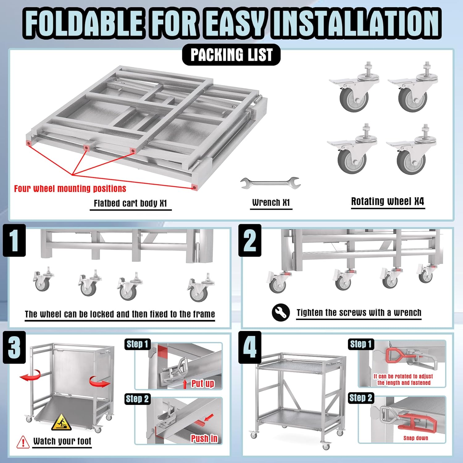 • 【Safe and stable】 it thickens the handrails and plates of the trolley, and performs a detailed treatment on the edge of the trolley to better extend the useful life. Equipped with multiple locking mechanisms, this stainless steel hand cart is securely held in place whether folded or in use, it can be used as a mobile workbench to complete DIY and other activities