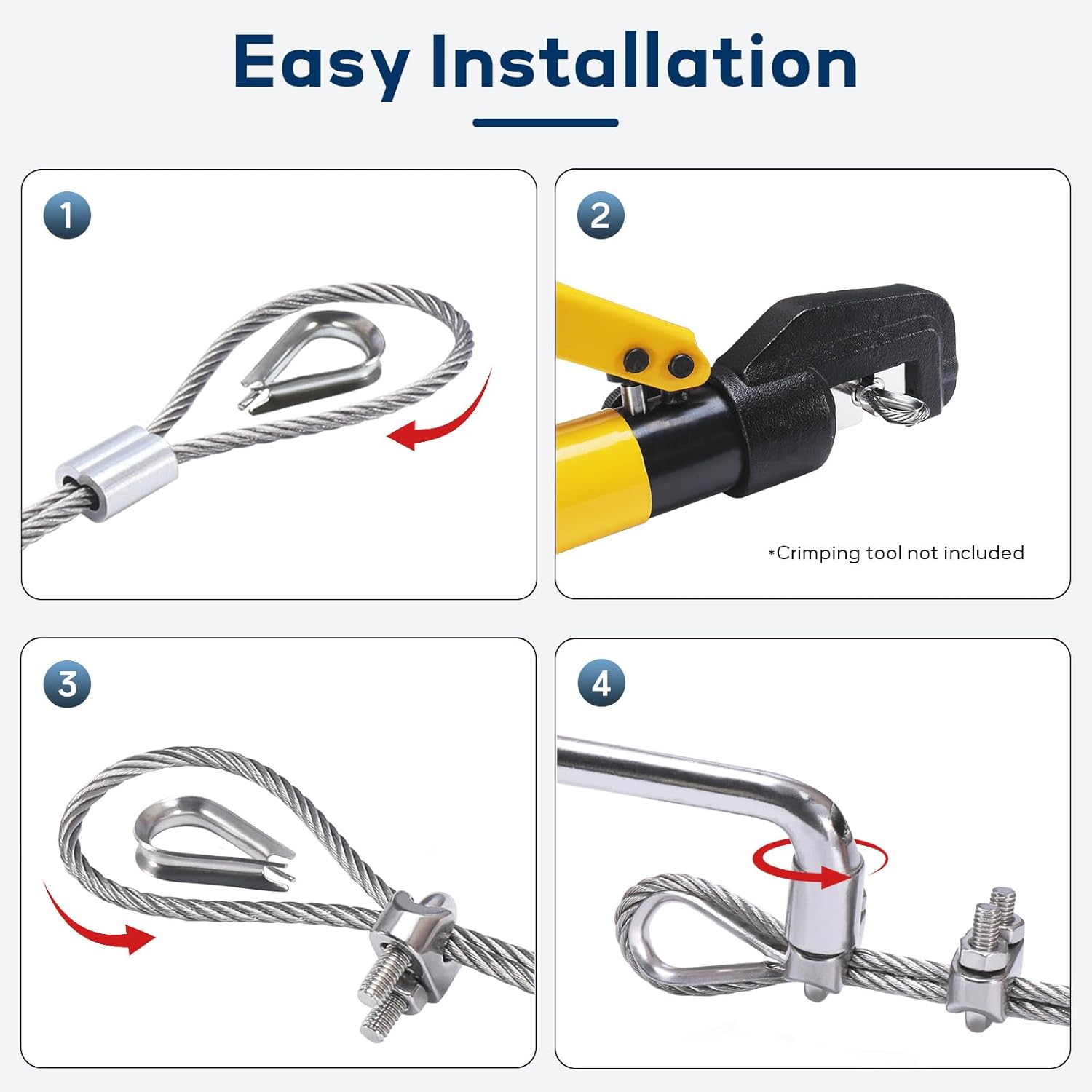 • Complete Kit for Quick Installation: Includes a sharp yellow cable cutter, 12 wire rope clips, 12 thimbles, 24 crimping sleeves, and 1 socket wrench. This kit provides all the essential tools needed for a quick and easy setup, saving you time and effort