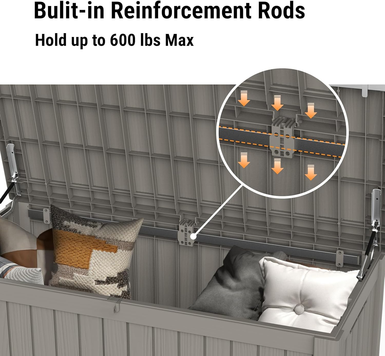 • 【Sturdy & Reinforced Structure】- Built for stability and strength, this deck box incorporates metal reinforcement rods boosting its structural integrity by 30%, not only prevents deformation but also allows the lid to support a remarkable weight capacity of up to 600 lbs, making it suitable for use as an additional bench or seating option