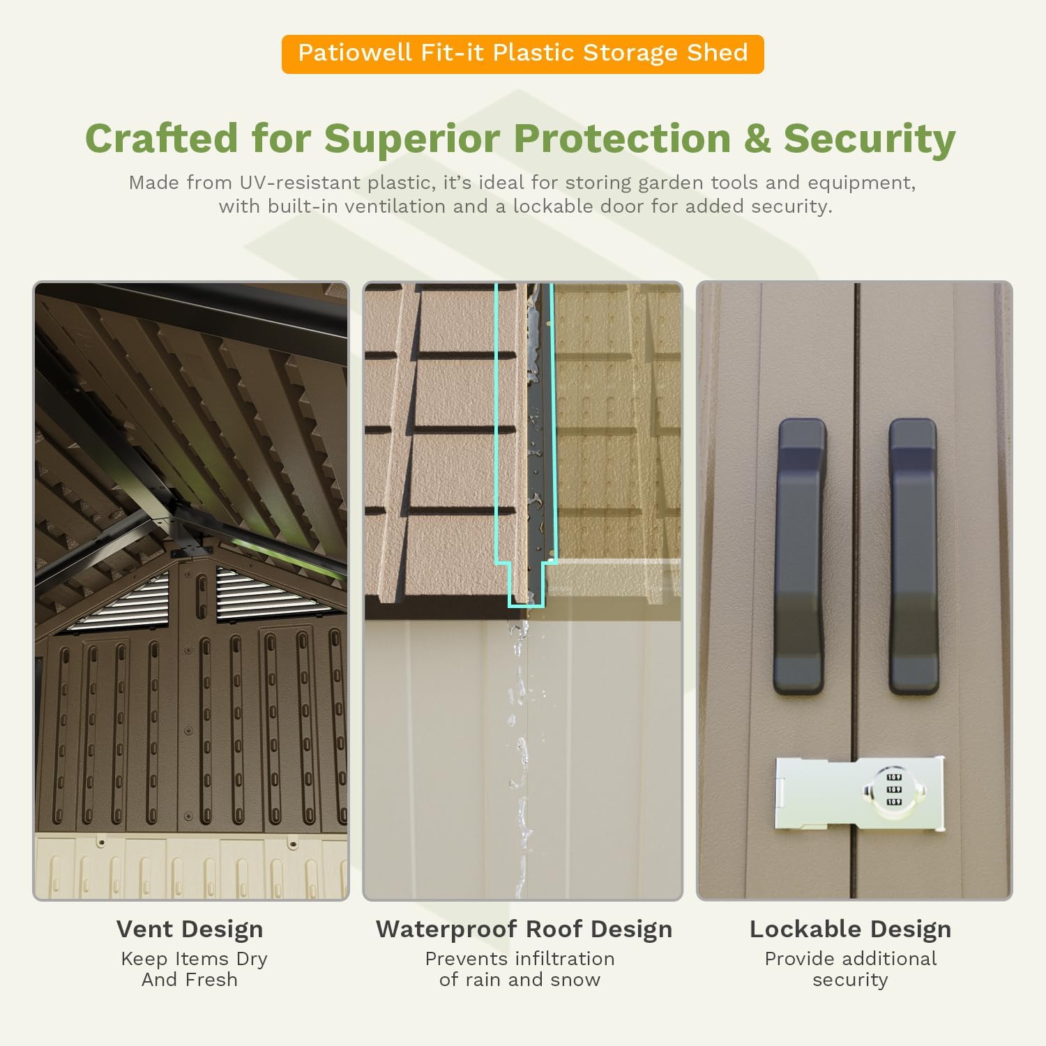 Patiowell 8 x 6 FT Plastic Outdoor Storage Shed with Floor, Resin Shed with Window and Lockable Door for Garden, Backyard, Tool Storage Use, Easy to Install in Brown (Kick-it Shed)