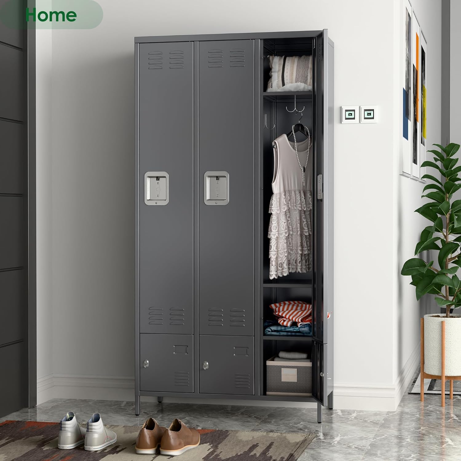 • 【Unique Design】Steel locker with 6 doors are equipped with ventilation holes,which help you keep items dry and ventilated, eliminating odor and moisture.Three large metal locker with plenty of room to store your stuff. Three small locker underneath for storing shoes and other items.