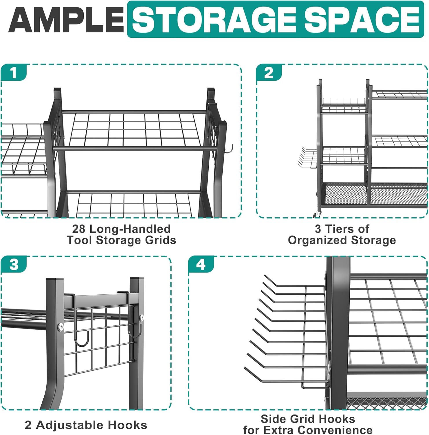 • Flexible Movement & Locking: Equipped with four heavy-duty wheels, this garden tool stand moves easily on uneven ground or grass. Two wheels feature a locking function to secure the rack in place when needed
