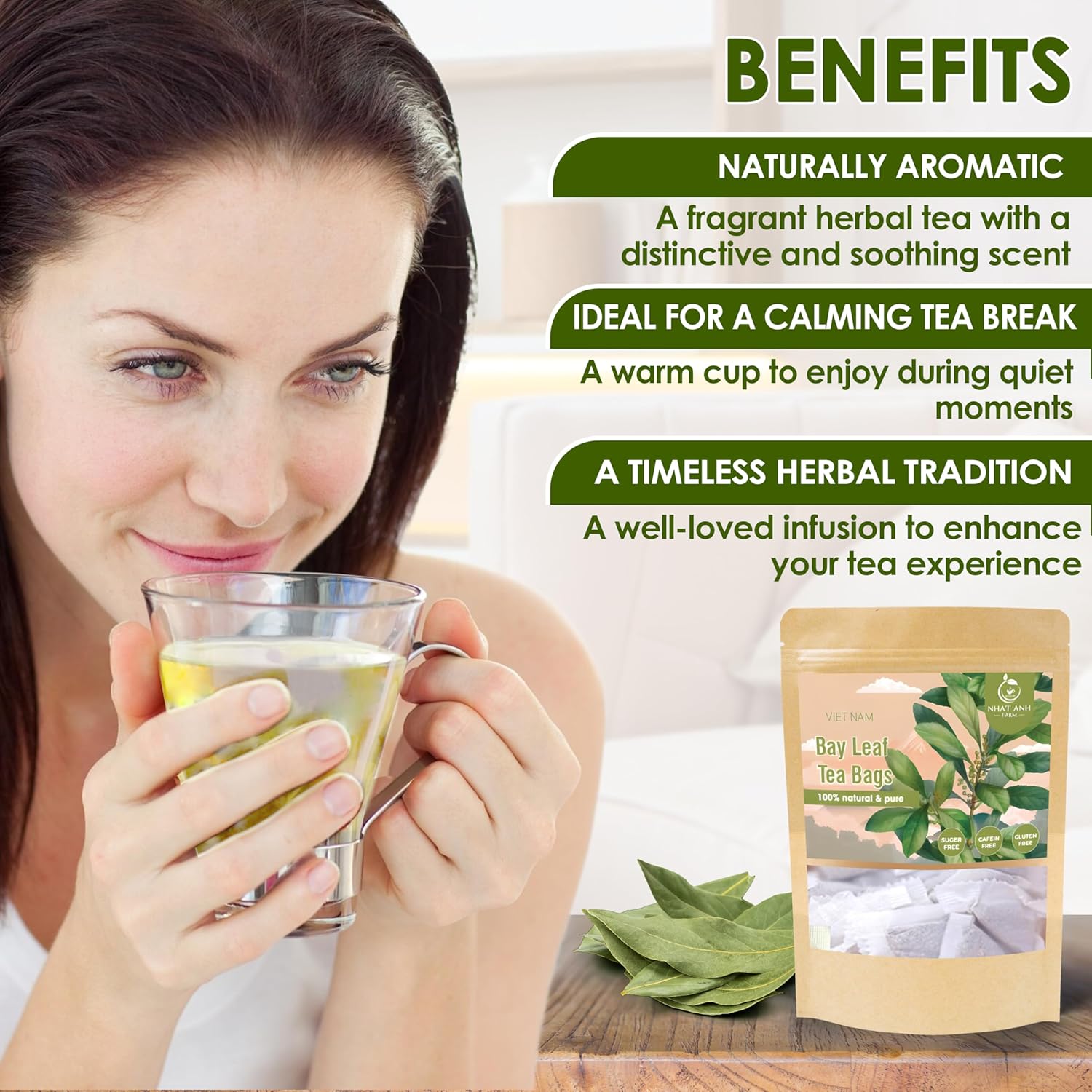 NHAT ANH FARM - Premium Bay Leaf Tea Bags, 40 Tea Bags, 100% Natural Dried Bay Leaf, Naturally Sweet Herbal Tea, Sugar-Free, Caffeine-Free, No Additives.