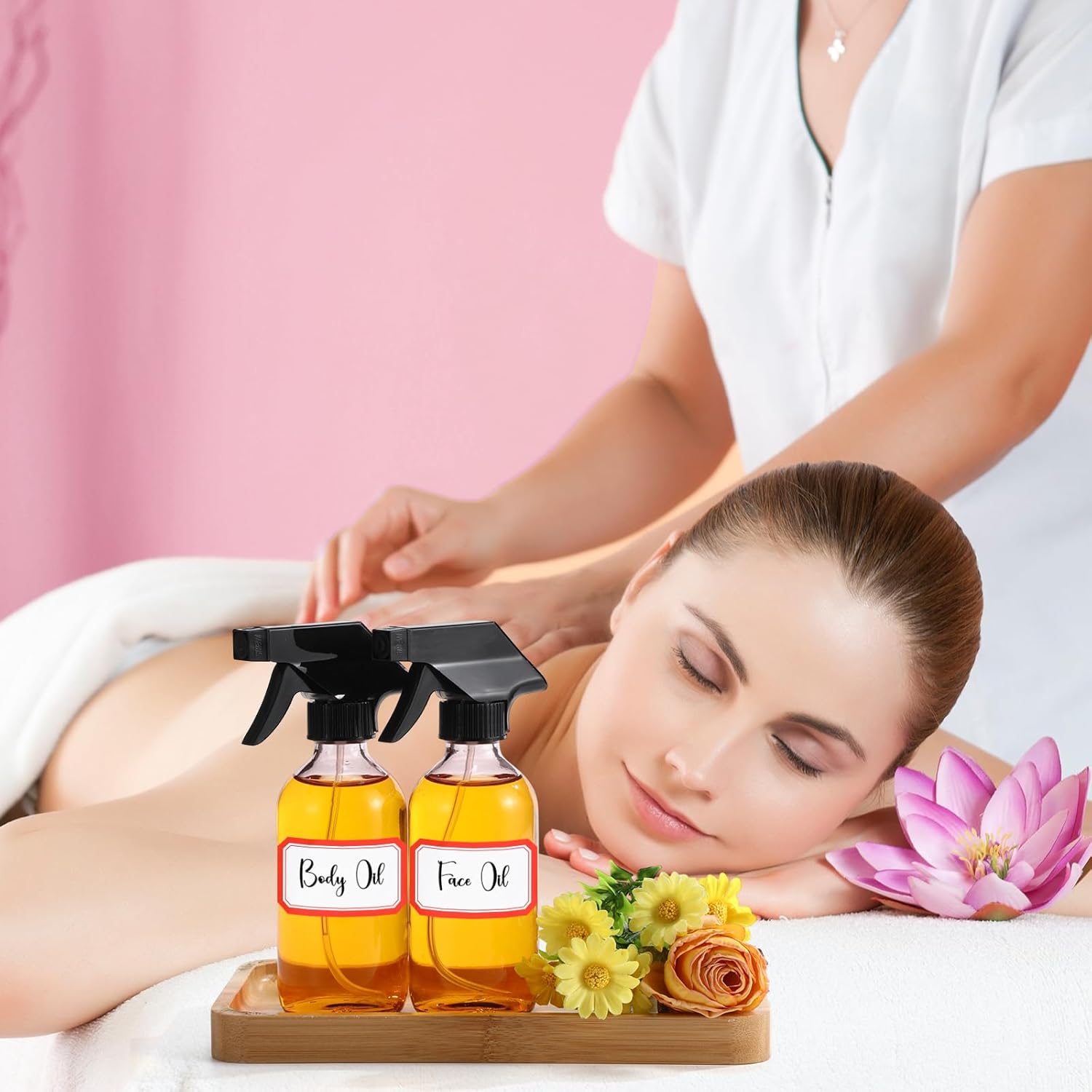 Norme 12 Pcs 8 oz Glass Spray Bottles with Funnels and Labels Refillable Cosmetic Empty Spray Bottles with Sprayer Containers for Essential Oil Cleaning Solutions(Pink,Classic)