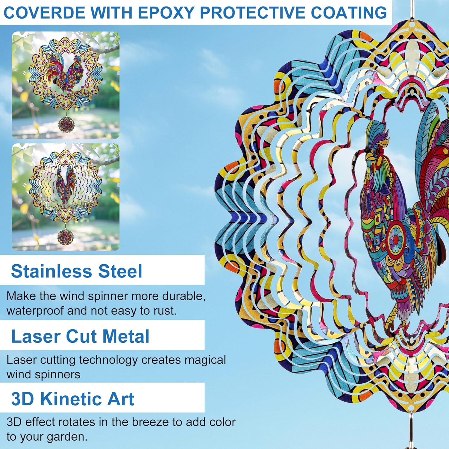 Wind Spinners Outdoor Hanging Rooster - Metal Chicken Gifts for Mom Women Grandma Men, 11.5 Inch 3D Stainless Steel Laser Cut Art Kinetic Wind Spinner for Indoor/Garden Porch Yard Decor