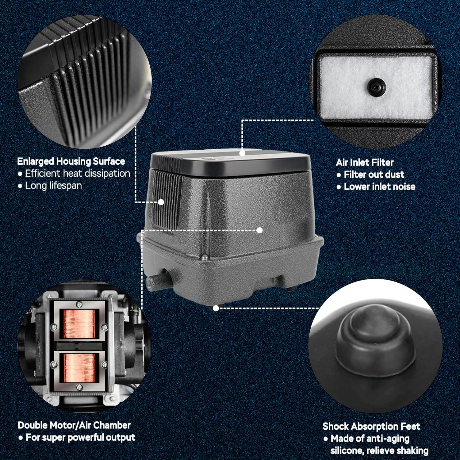 • SPECIFICATION - This linear air pump delivers a max of 1600GPH powerful airflow at 0.035MPa pressure with an 60W energy-efficient copper coil motor that runs in stable operation and lasts longer. Perfect as a pond aerator, septic aerator, hydroponic air pump, or aquarium air pump, it provides high efficiency, low heat and low power consumption.