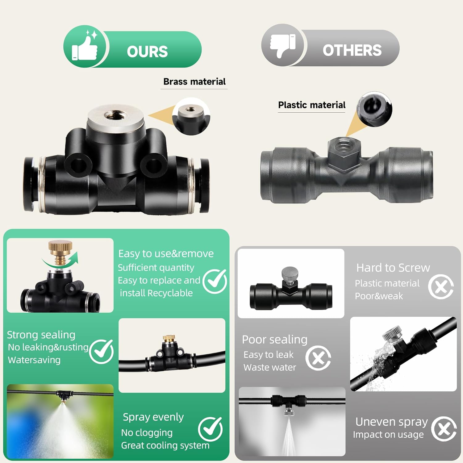 • ANTI LEAK & WATER SAVING: Brass Misting Nozzles and Irrigation Fittings are crafted from premium brass and rust-proof plastic, ensuring strong sealing and preventing leaks. They are easy to install and significantly reduce water wastage. (According to NFAMRZCAR laboratory testing, WATER SAVING CAN REACH UP TO 95%.) This perfect outdoor misting system for cooling makes a substantial difference in temperature
