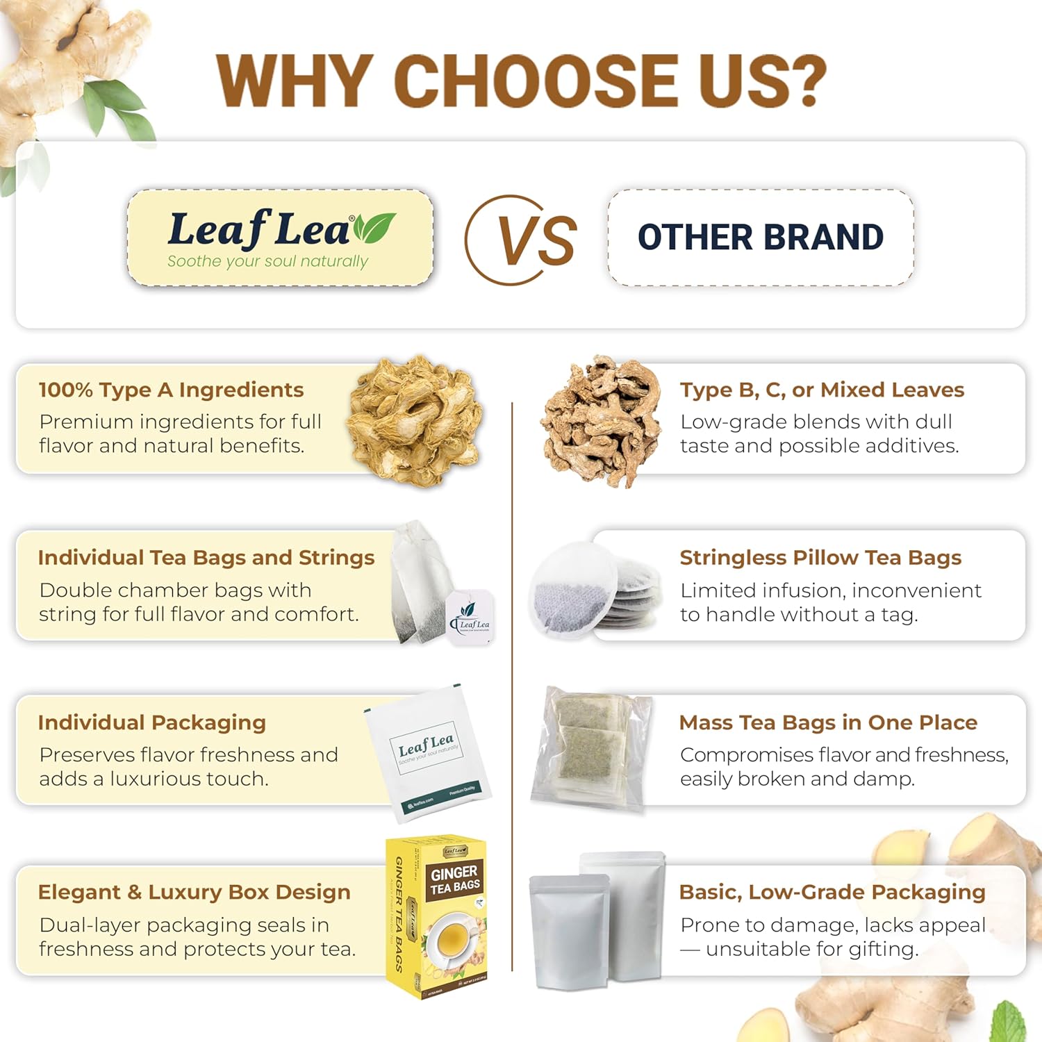 LeafLea 120 Ginger Tea Bags, 100% Pure Ginger Root Herbal Tea, Spicy & Warming Flavor, Supports Digestion & Immune Health, Individually Wrapped, Caffeine-Free, Sugar-Free, Gluten-Free, Non-GMO, Vegan