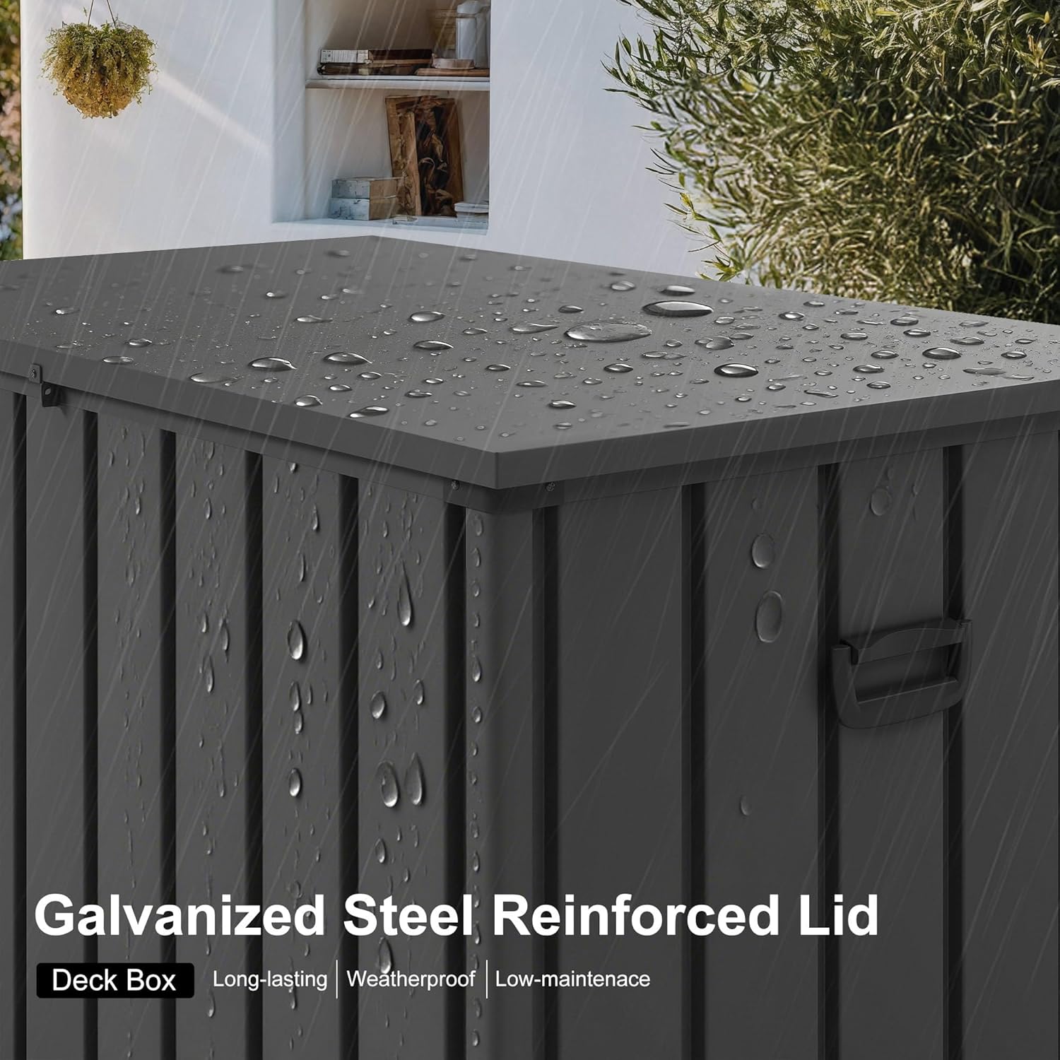 • Galvanized Steel Reinforced Lid:This sturdy storage box features a galvanized steel-reinforced lid that is fade-resistant, weatherproof, and rustproof for at least 2 years.