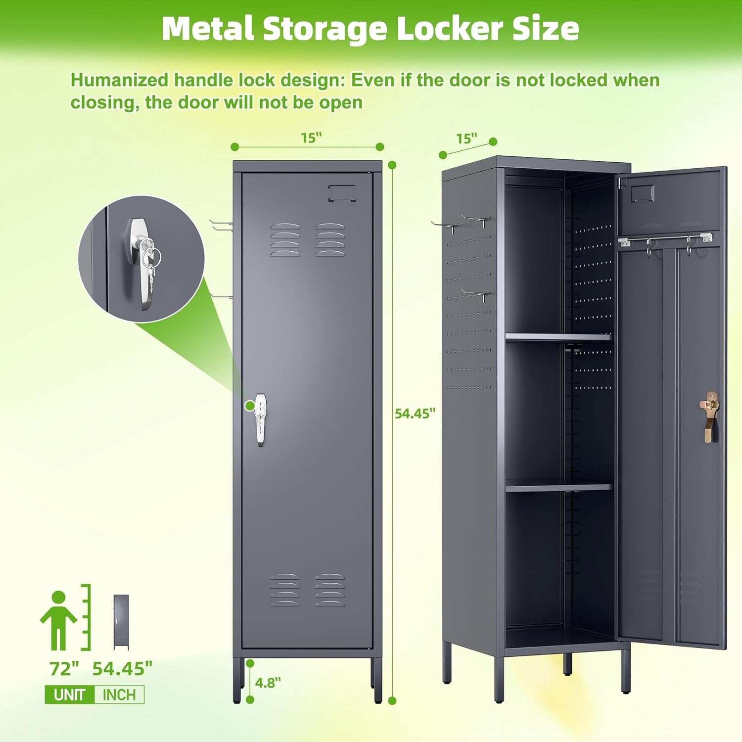 • 【Large Storage Capacity】1 door metal lockers for employees with Lock 15"D x 15"W x 54"H. Equipped with 5 hooks and 2 Pegboard,it can meet your needs for storing different sized items and meet most of your daily needs.