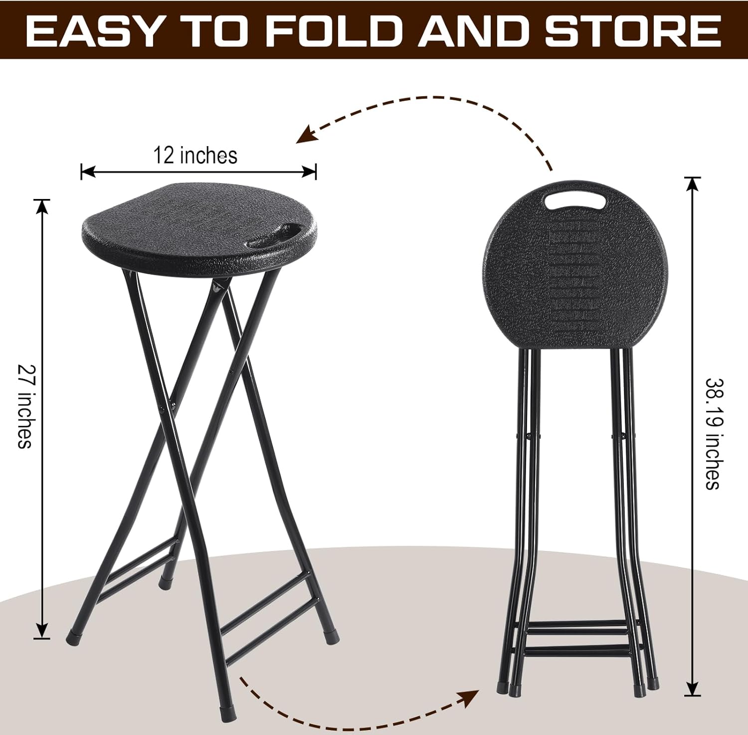 • Easy to Fold: our folding counter height stool can be folded when not in use and stored in tight corners or car trunks to save more room, has a handle design that is convenient to carry and move, providing maximum utility when needed; This practical design makes storage and handling easier and quicker