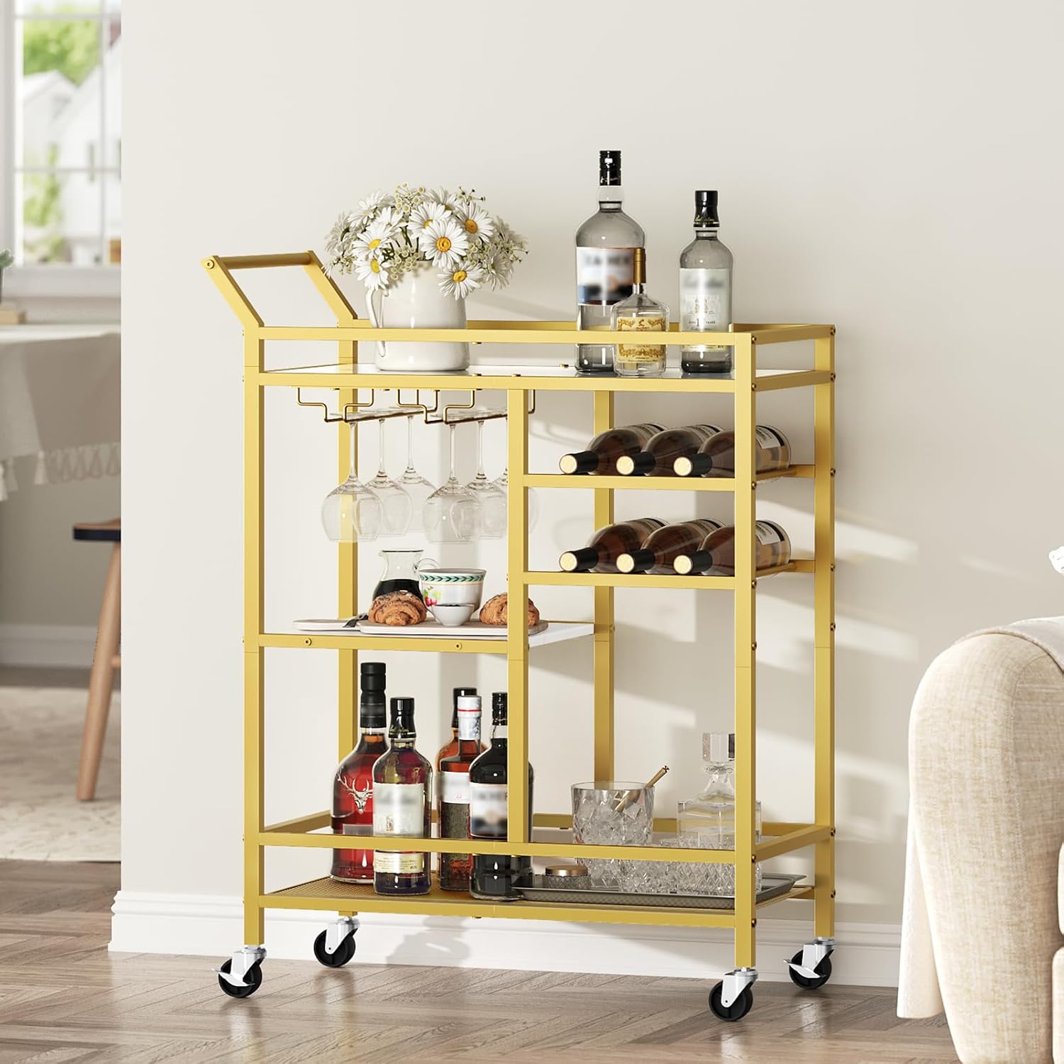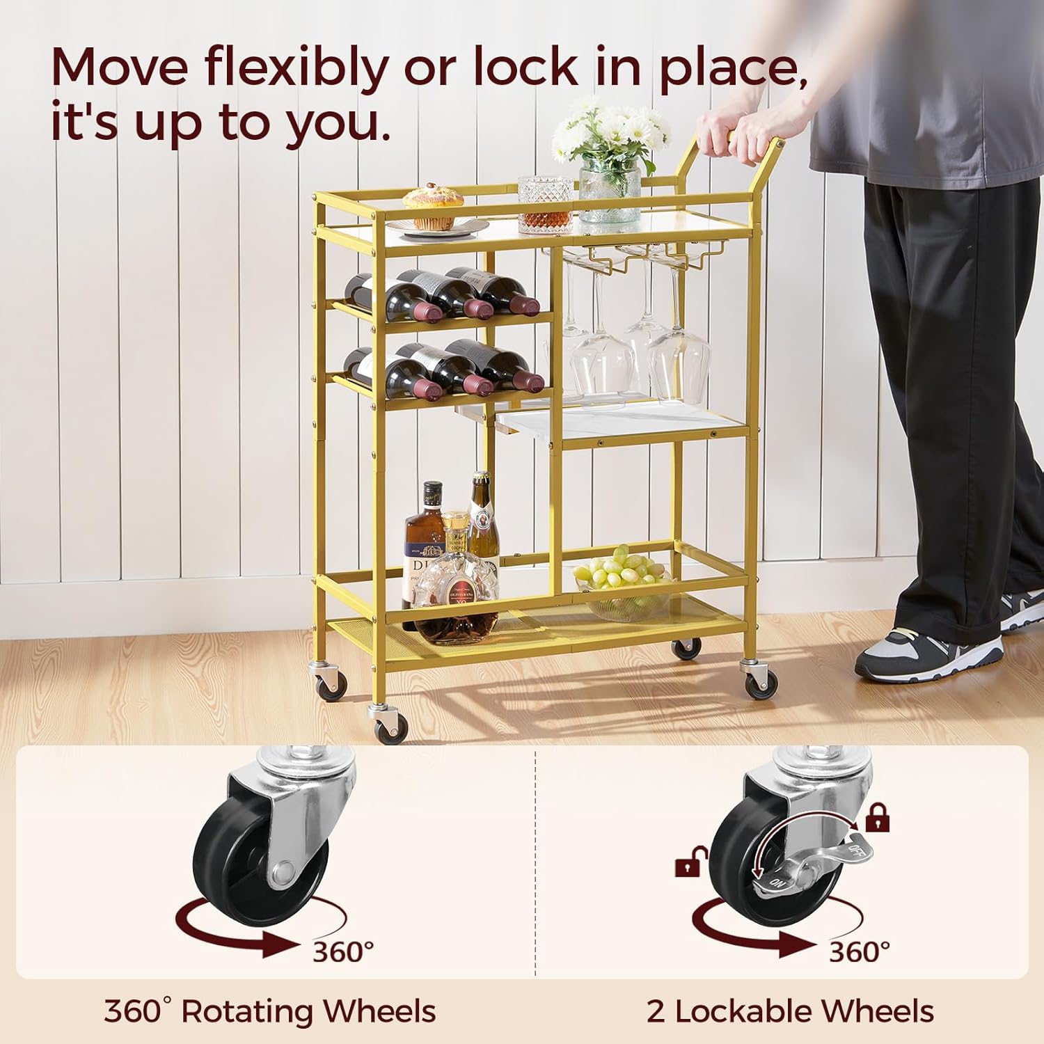 • Versatile Use: This mobile bar cart serves as a kitchen trolley, coffee cart, beverage station, and even adds a stylish touch to entryways, living rooms, or offices. Whether serving drinks or storing items, it delivers both function and flair