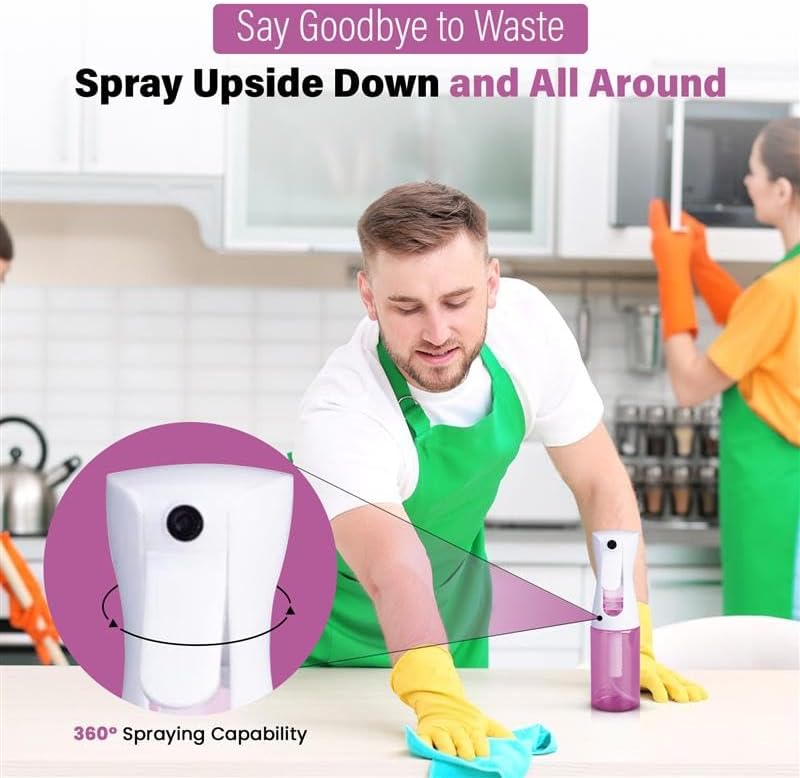 • 360-DEGREE SPRAYING: The continuous spray bottle allows 360-degrees spraying for those areas which are difficult to reach. You can even use it sideways and upside down. Mist spray bottle provides 98% water evacuation so you can utilize even the last drop of liquid.
