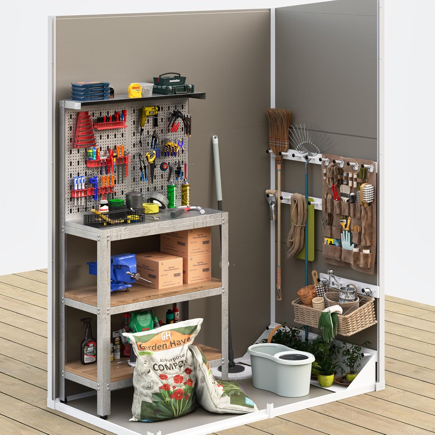 • STURDY FLOOR & WINDOW: Equipped with a sturdy floor, our outdoor storage cabinet effectively prevents moisture from seeping into the structure, safeguarding your belongings from potential damage caused by dampness, mold, or rot. The window design facilitates ventilation and natural light. It allows the visibility of tools from the outside and enhances the aesthetics of the shed