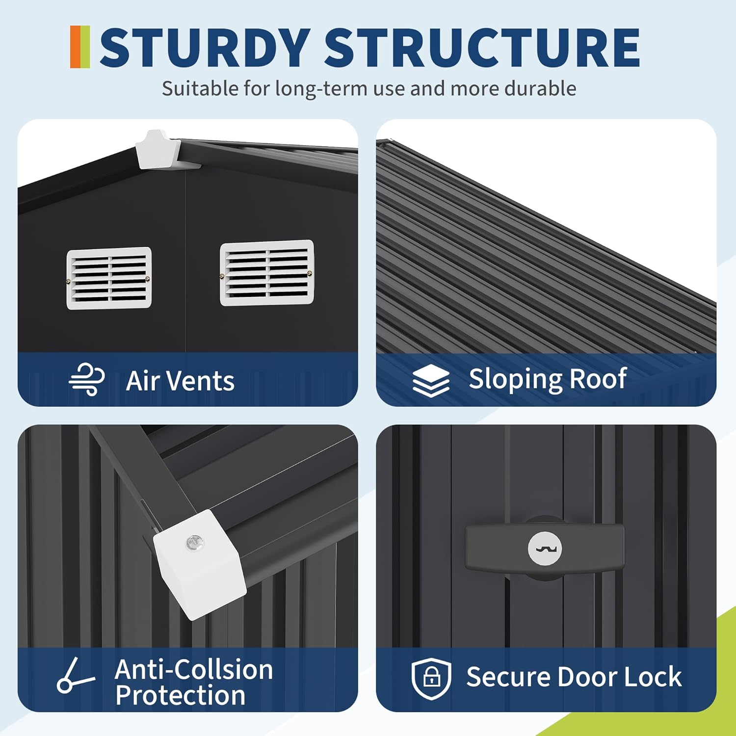 • SLOPED ROOF & LOCKABLE DOOR & AIR VENTS - The sloped roof is designed to let rainwater flow out quickly. The lockable doors can enhance security and prevent strangers or small animals from entering accidentally. The design of air vents can effectively improve air circulation and prevent your items from getting moldy and damaged in humid and hot summers. Plastic protective caps are provided for the sharp corners of the ceiling and each screw to prevent injuries during construction or use