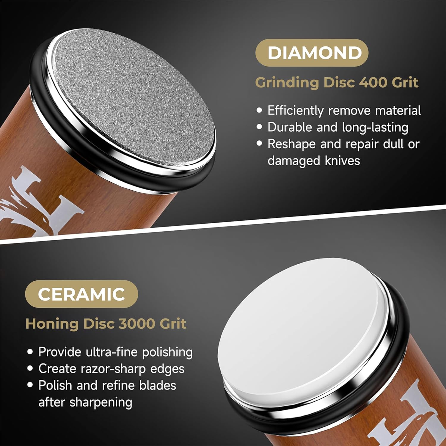 • ✅ Pro Results – No Skill Needed – Whether you're a beginner or a seasoned chef, achieve razor-sharp edges in seconds. The intuitive design, easy-to-swap discs, and dry sharpening system make blade maintenance simple and mess-free.