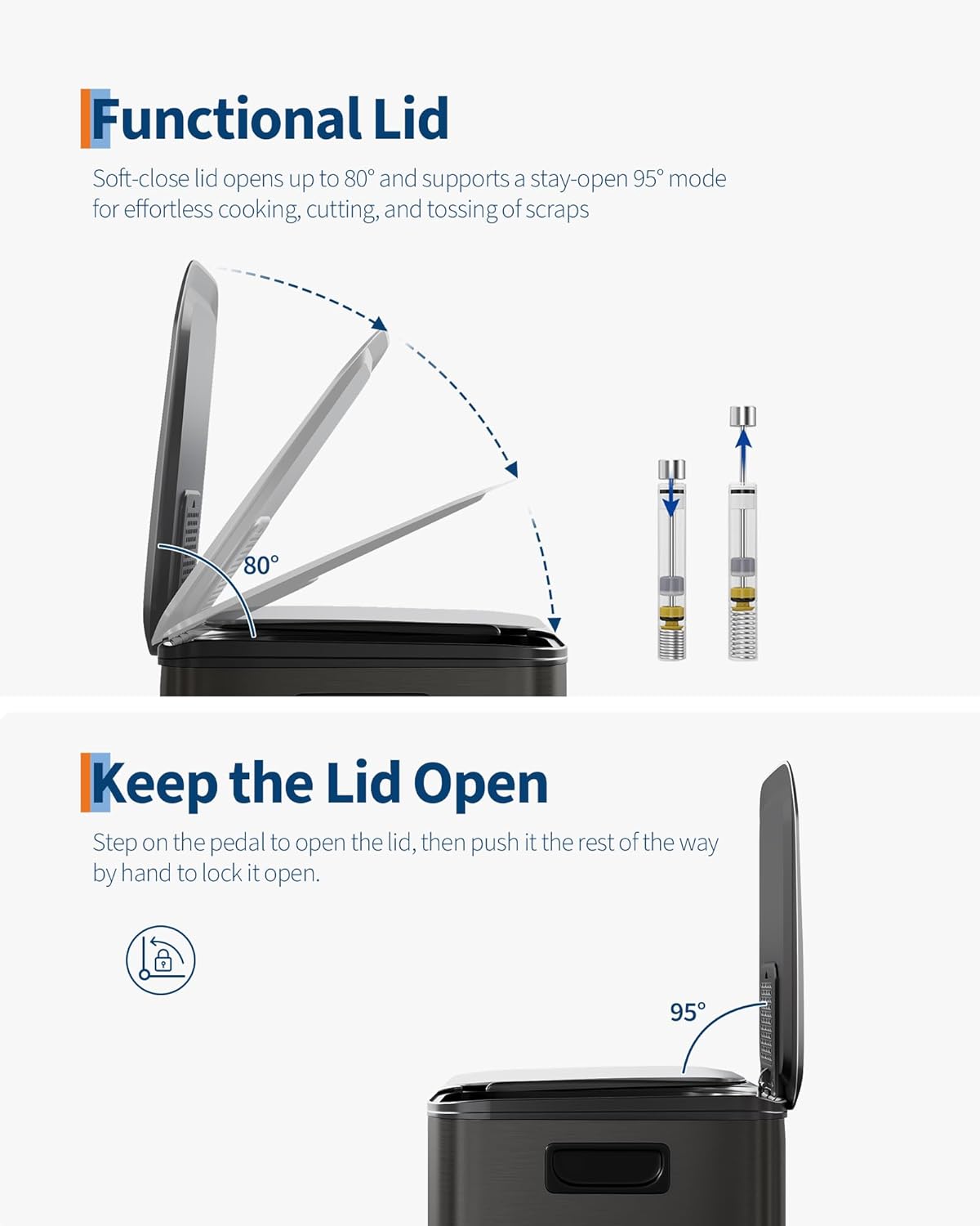 • [PRACTICAL DESIGN] – GarveeHome’s dual trash and recycling bins put ease of use first. Ergonomic side handles let you lift and relocate the entire unit effortlessly. The soft-close lid opens to 80° without collision with standard kitchen island edges, and locks at 95° for hands-free cooking prep and scrap disposal. Dual inner buckets with weighted-edge lids trap odors separately. A custom liner ring secures any standard bag snugly, eliminating slips, bunching, and overhang