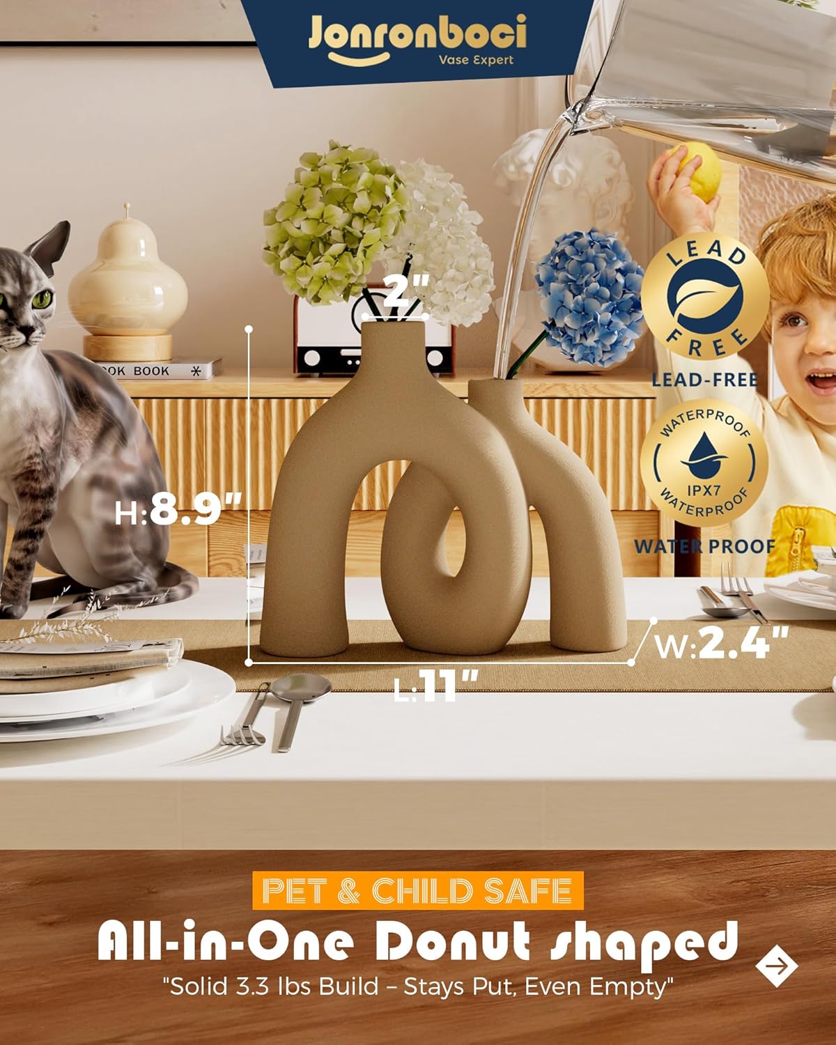 • Size - This set includes one matte tan brown handmade vases. Conjoined Size W 10" X , H Small: 7.3" and Large 8.9", with a vase neck of 1.5". Both vases feature a rustic farmhouse style.
