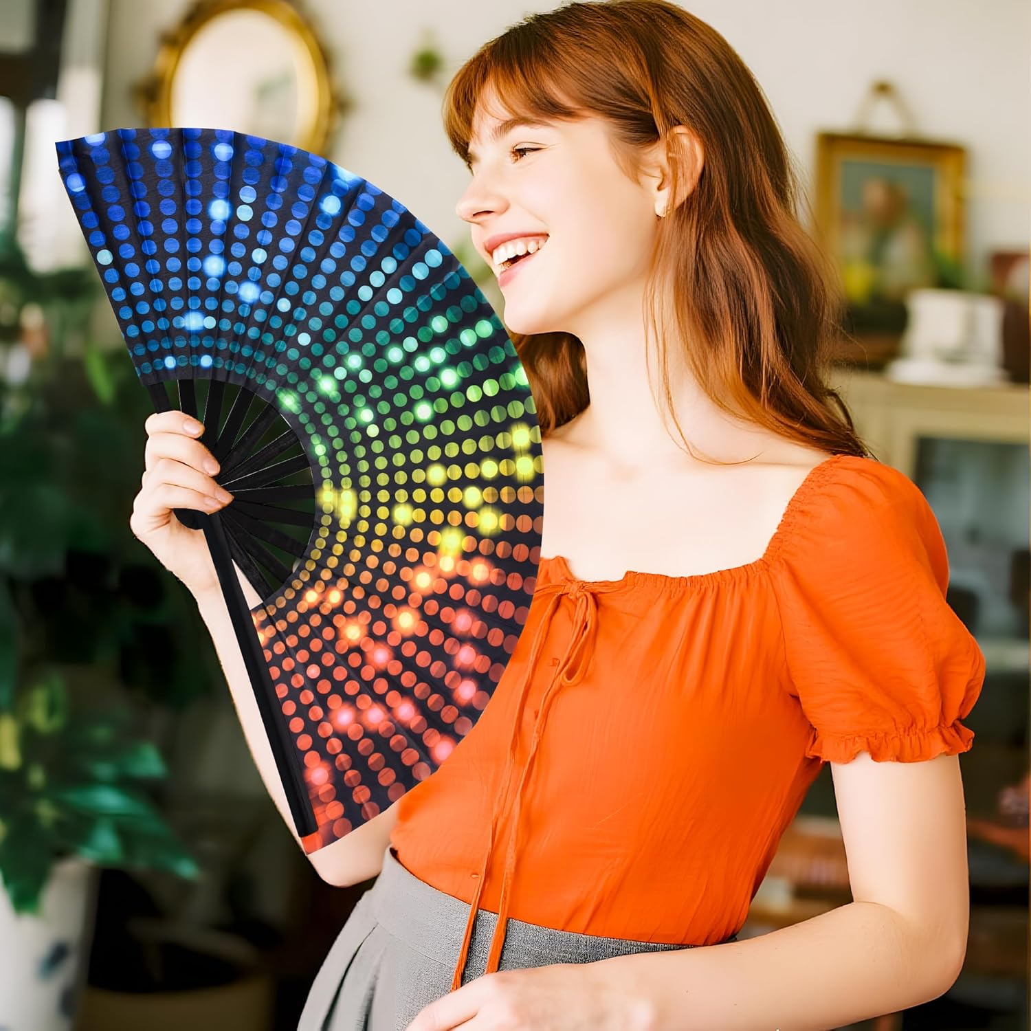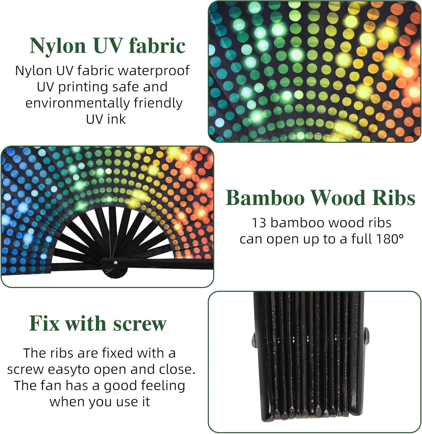 • BRIGHT COLORS:The bamboo fan features a glittery fluorescent ink design that sparkles in lightor sunlight, with bright and vivid colors enhancing your performance with vibrant charm