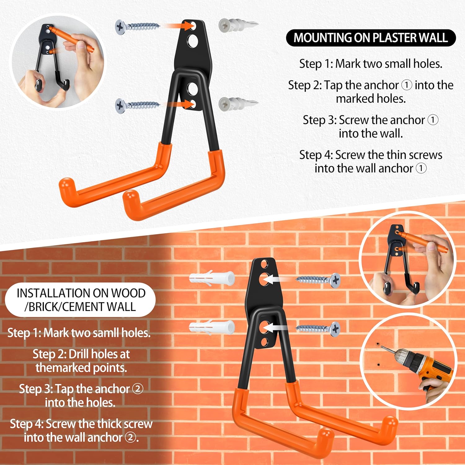 • Easy Installation: Enjoy hassle-free setup with our utility hooks that come with two types of screws and anchors, making them compatible with drywall, wood, brick, or concrete walls. Transform your garage organization!