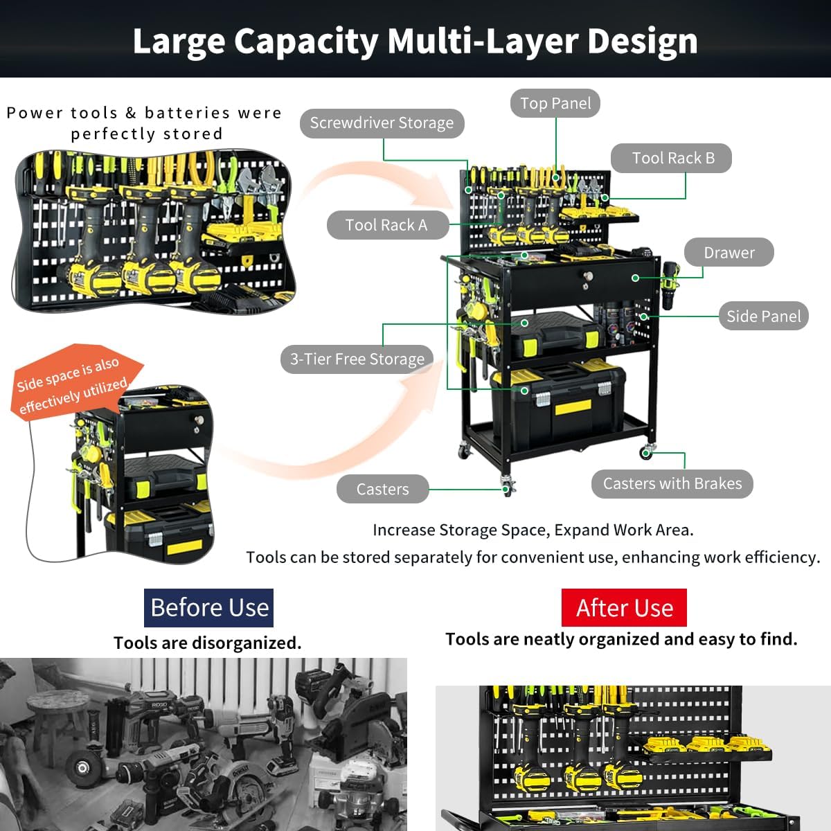 • 【Garage Organizer Storage】 Designed for power tool organization, this rolling tool cart keeps your garage neat and efficient.