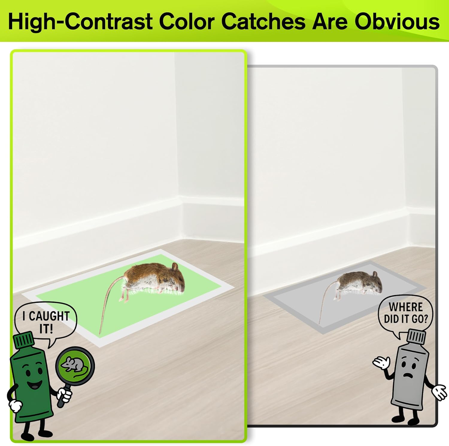 • [Green Glue Stress Free Check ]Our mice glue boards utilize an advanced glue formulation for catch and hold. High contrast glue color allows for quick rodent identification no need to get too close and face an uncomfortable sight. Note: Rodent may still be alive when trap is checked
