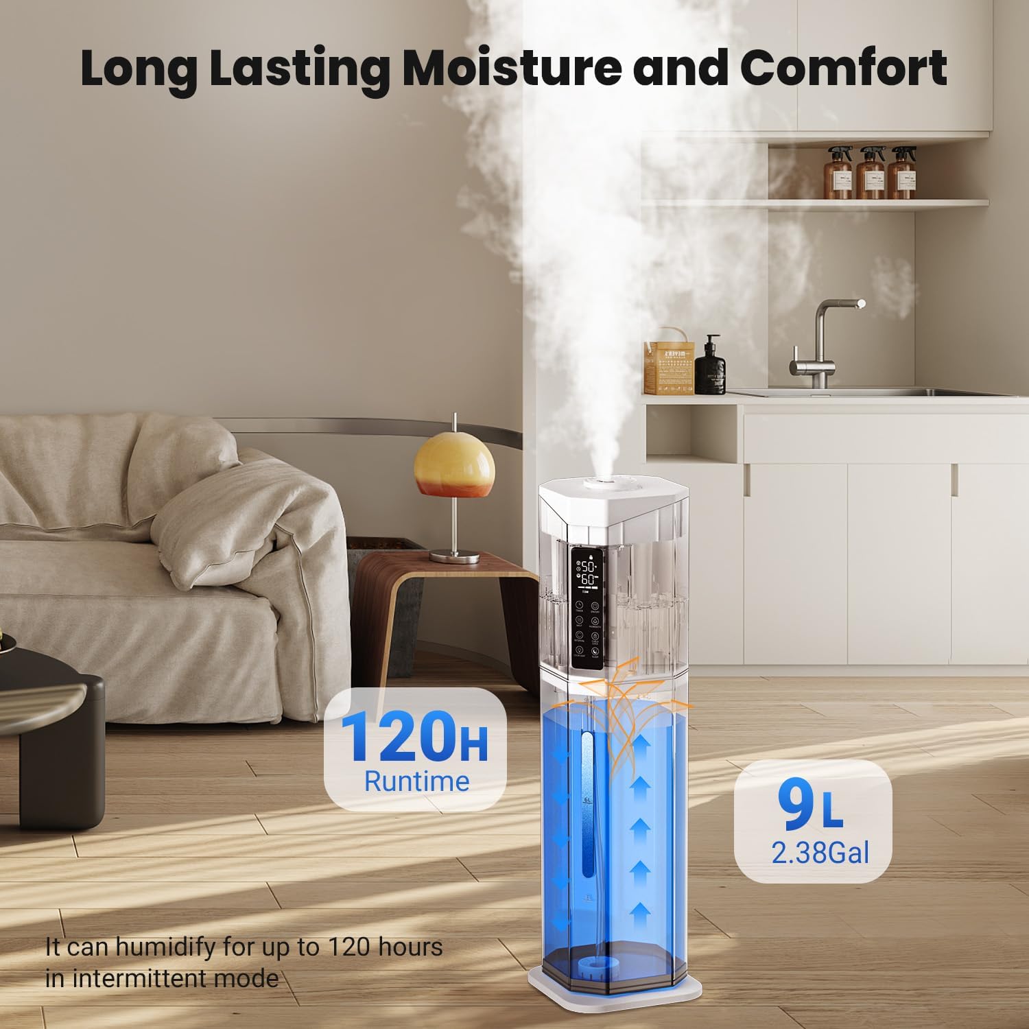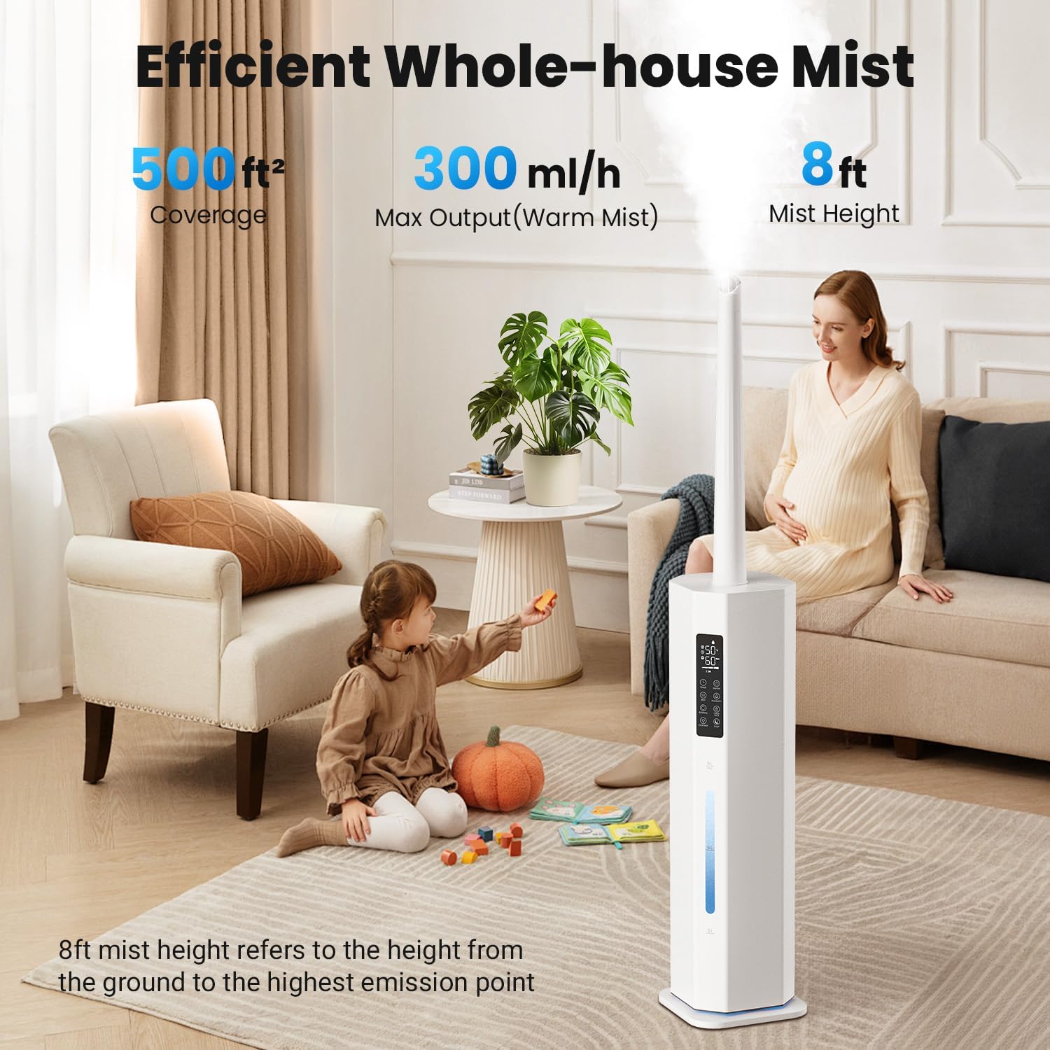 • 𝑺𝒖𝒑𝒆𝒓-𝒍𝒐𝒏𝒈 120𝑯 𝑹𝒖𝒏𝒕𝒊𝒎𝒆 & 𝑬𝒙𝒕𝒆𝒏𝒔𝒊𝒗𝒆 500 𝒔𝒒 𝒇𝒕 𝑪𝒐𝒗𝒆𝒓𝒂𝒈𝒆: Tired of constant refills? Features 3 adjustable mist levels (max output: 300mL/h). This top-fill whole house humidifiers runs up to 120 hours on a single fill (Interval Mode on), minimizing hassle. Enjoy healthier air across spaces up to 500 sq ft – perfect for nurseries, bedrooms, living rooms, offices, greenhouses, and more