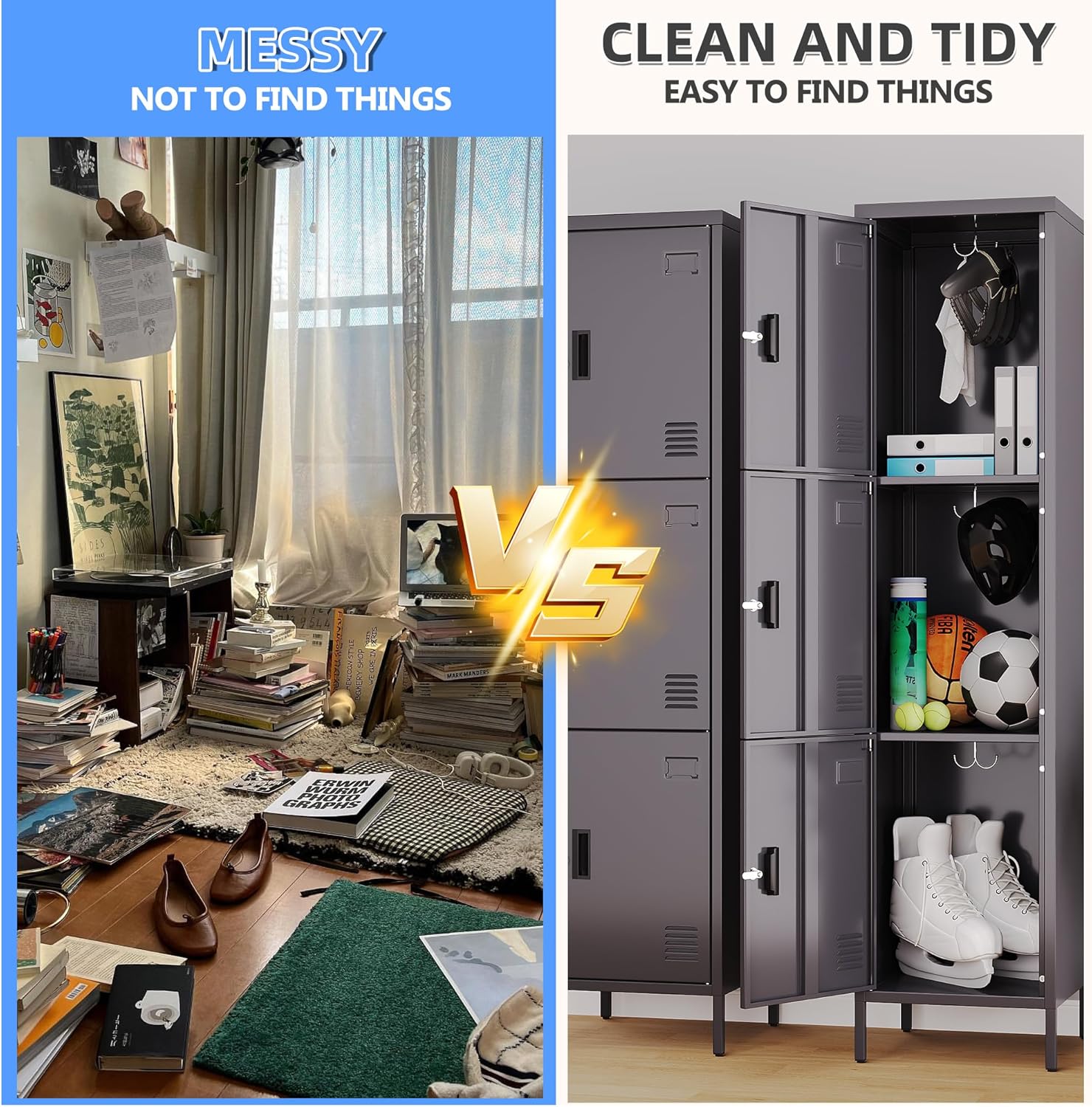 • 3 Lockable& Magnetic Doors: There is employee locker has 3 doors which can be locked separately.What's more,the key to each door are not universal,it can be used by 3 people respectively. The door of this storage locker is also designed with magnetic suction, which can keep it closed even when it is not locked, not only ensuring the safety of the items but also keeping it tidy.