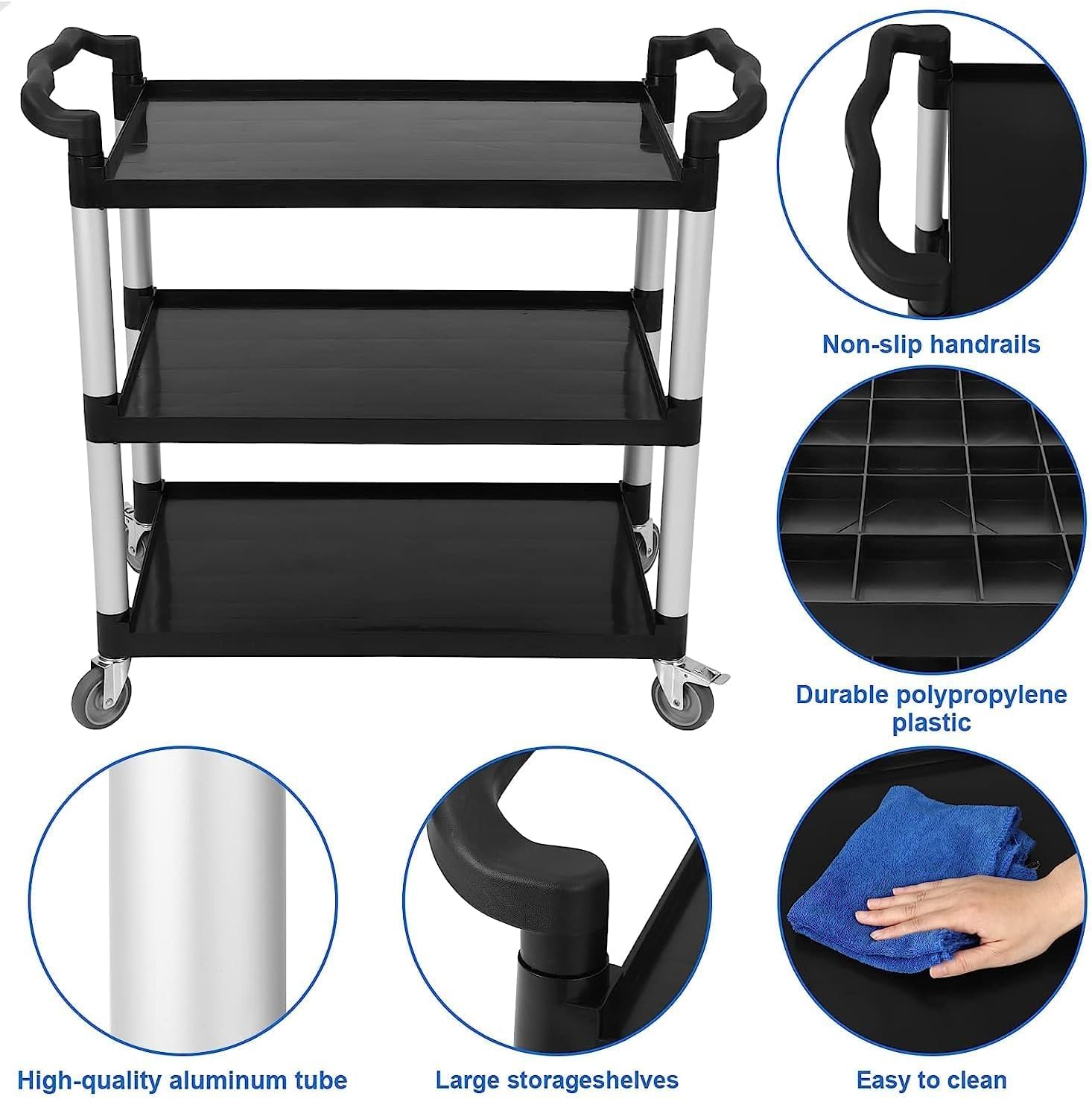 3-Shelf Heavy Duty Rolling Utility Cart 360 Lbs Capacity – 42" Wx20 Dx39 H Black Cart with Lockable 360° Swivel Wheels | Easy Maneuverability for Restaurant, Foodservice & Cleaning
