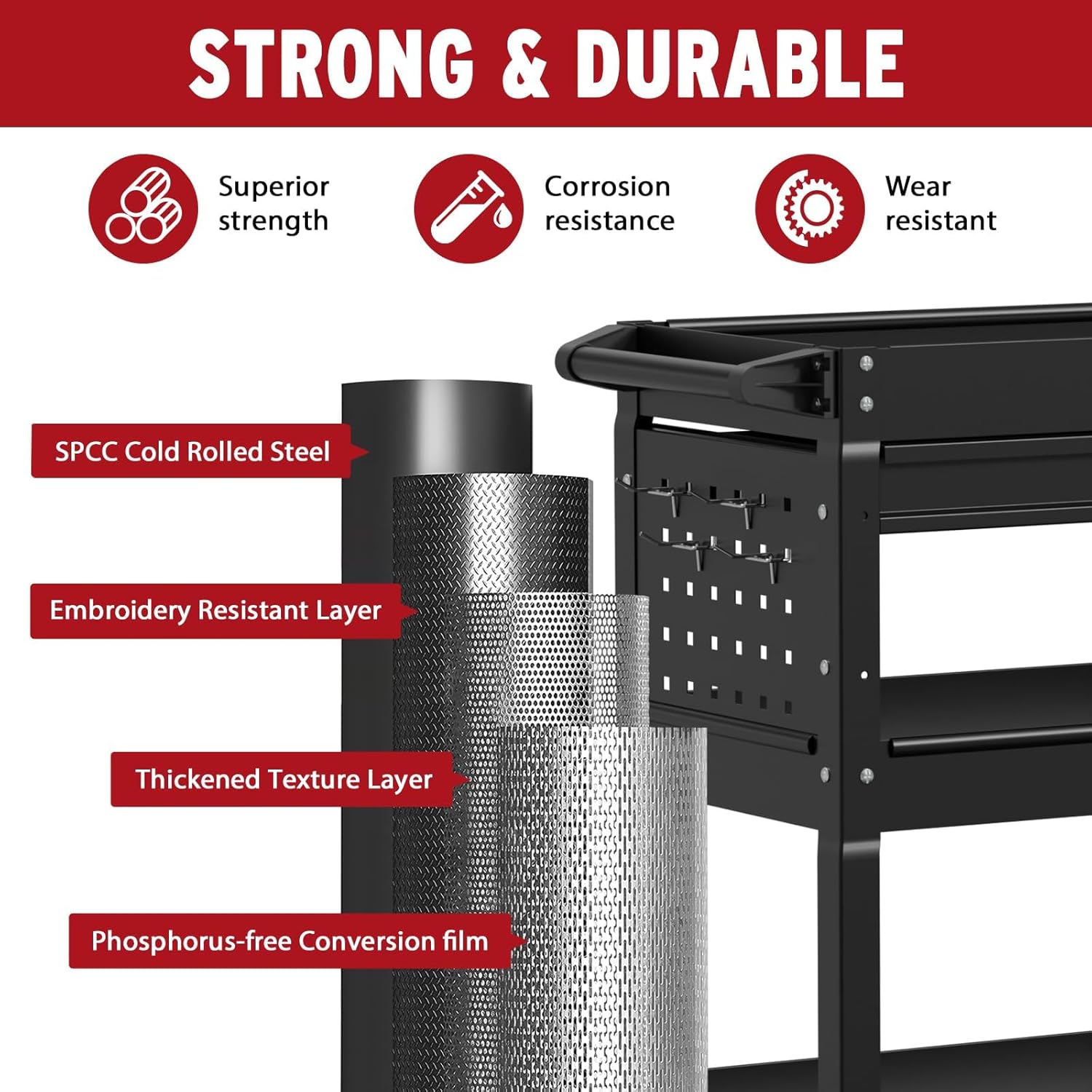 • Sturdy Construction: This tool cart with drawers is made of a high-quality cold-rolled steel plate with powder coated finished,which ensures its long-term use. Also its durable construction can withstand heavy loads.