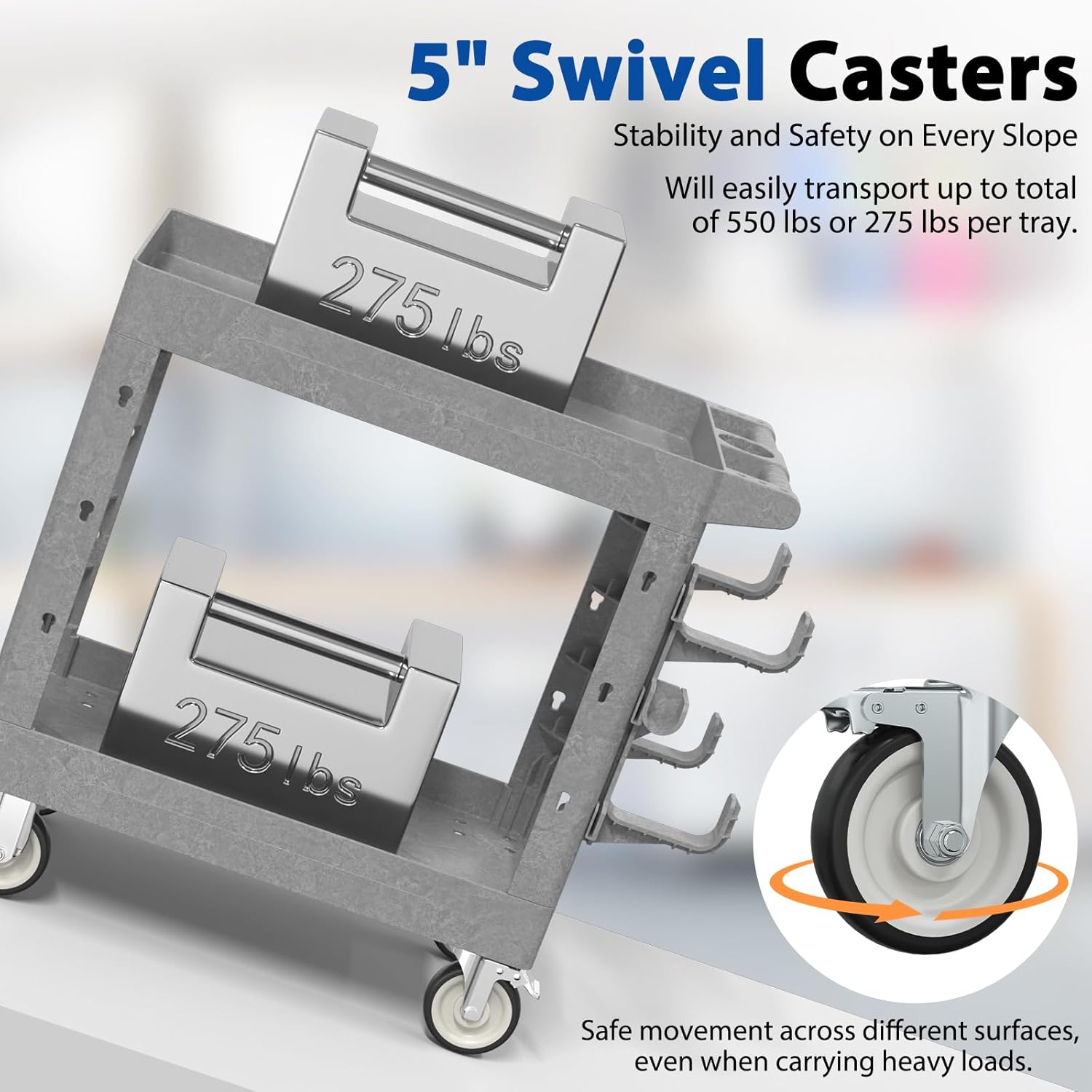 • 【Heavy-Duty Load Capacity】 Constructed from high-quality polypropylene (PP), this rolling utility cart is lightweight yet durable, resistant to scratches, rust, and dents, supporting up to 550 lbs (275 lbs per shelf). Perfect for use as a tool cart on wheels, work cart, or plastic utility cart for heavy-duty tasks.