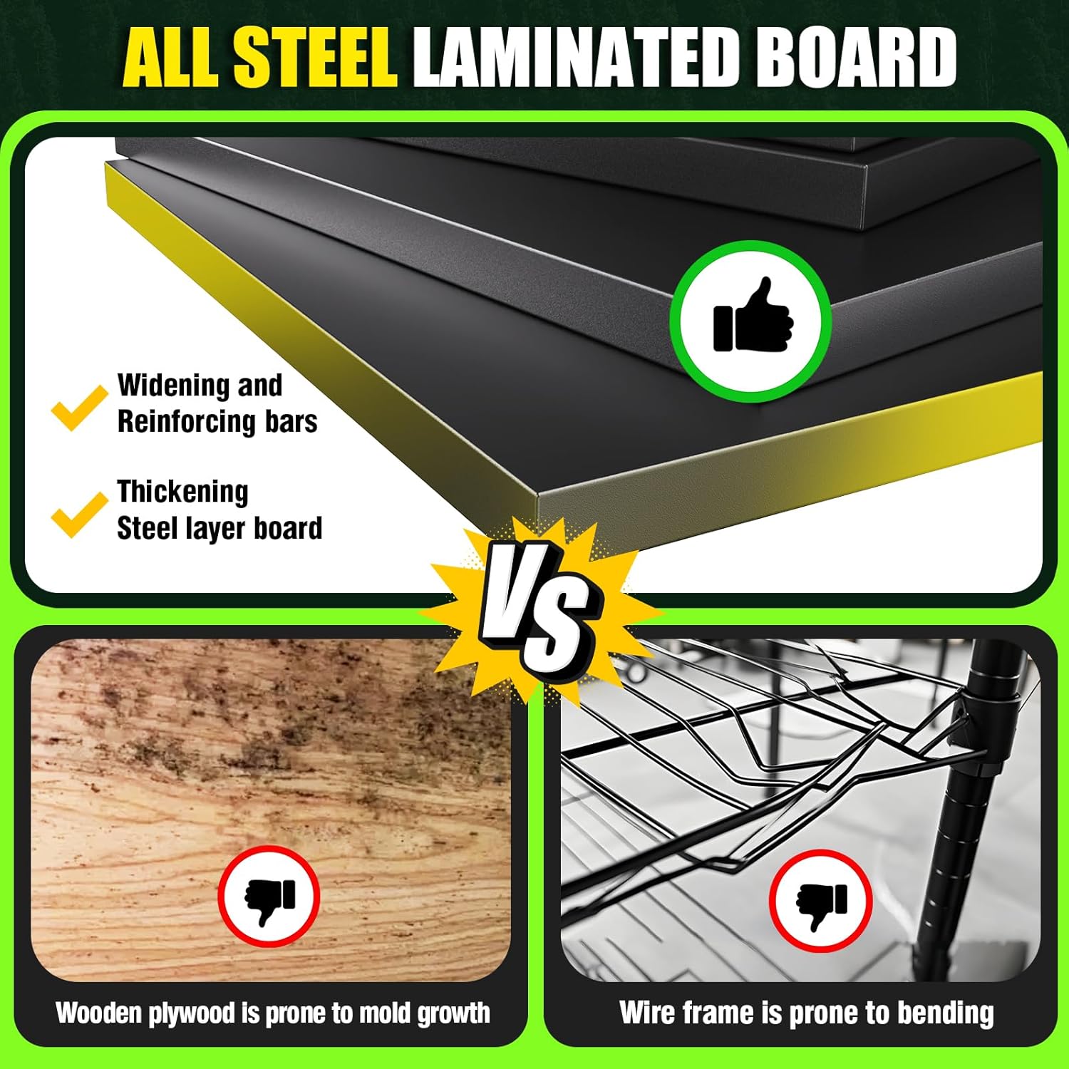 • 【Ultra-strong load-bearing】This garage shelves is made of high quality cold rolled steel, strictly selected and carefully processed to make this metal storage shelving. Whether you are storing heavy goods or daily necessities, you can ensure that the long-term use will not be deformed. This garage shelving has gone through a lot of load-bearing tests, easily face all kinds of storage needs, and provide reliable support for your items!