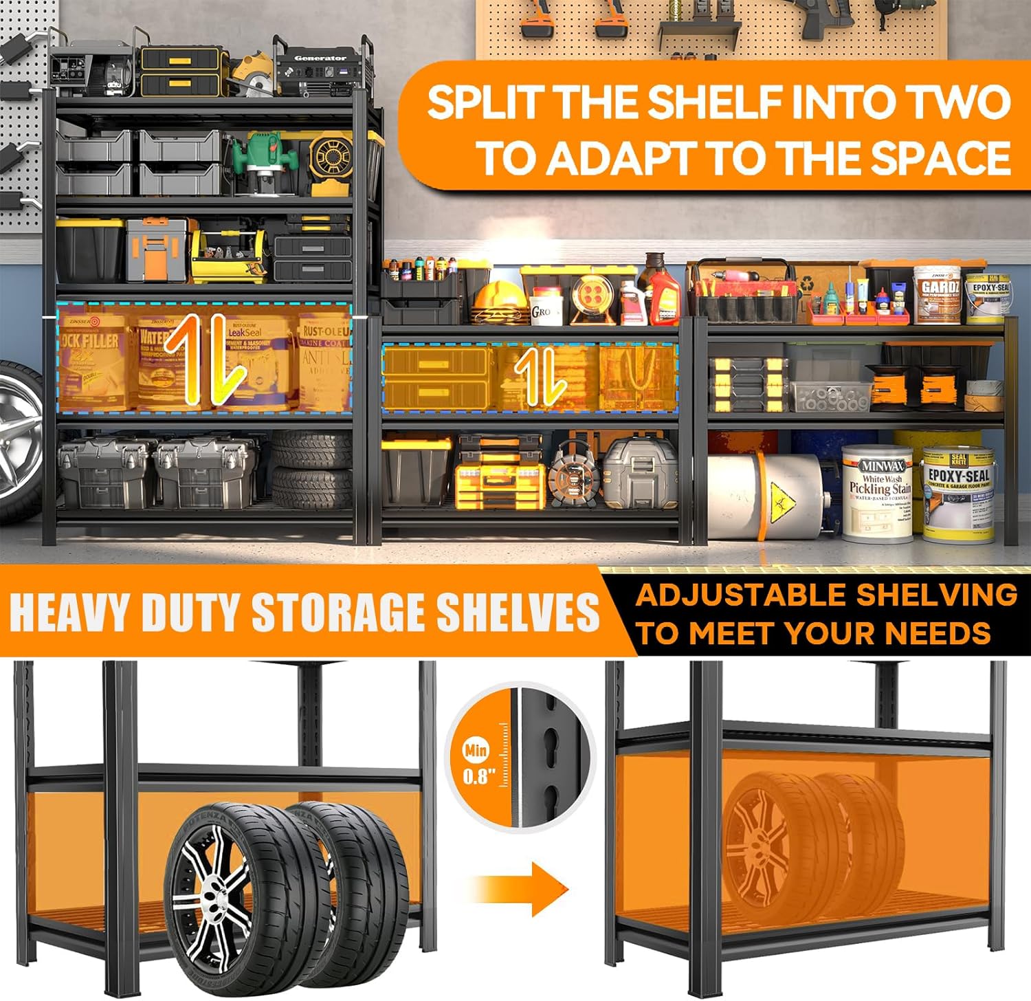 • Adjustable and Detachable Metal Garage Shelves: The metal garage shelf features freely adjustable height, allowing it to accommodate items of varying sizes. This flexibility adapts seamlessly to diverse storage scenarios, helping you maximize space utilization. What's more, the garage shelving unit can be split into two separate shelves, catering to your different needs and providing a versatile storage solution