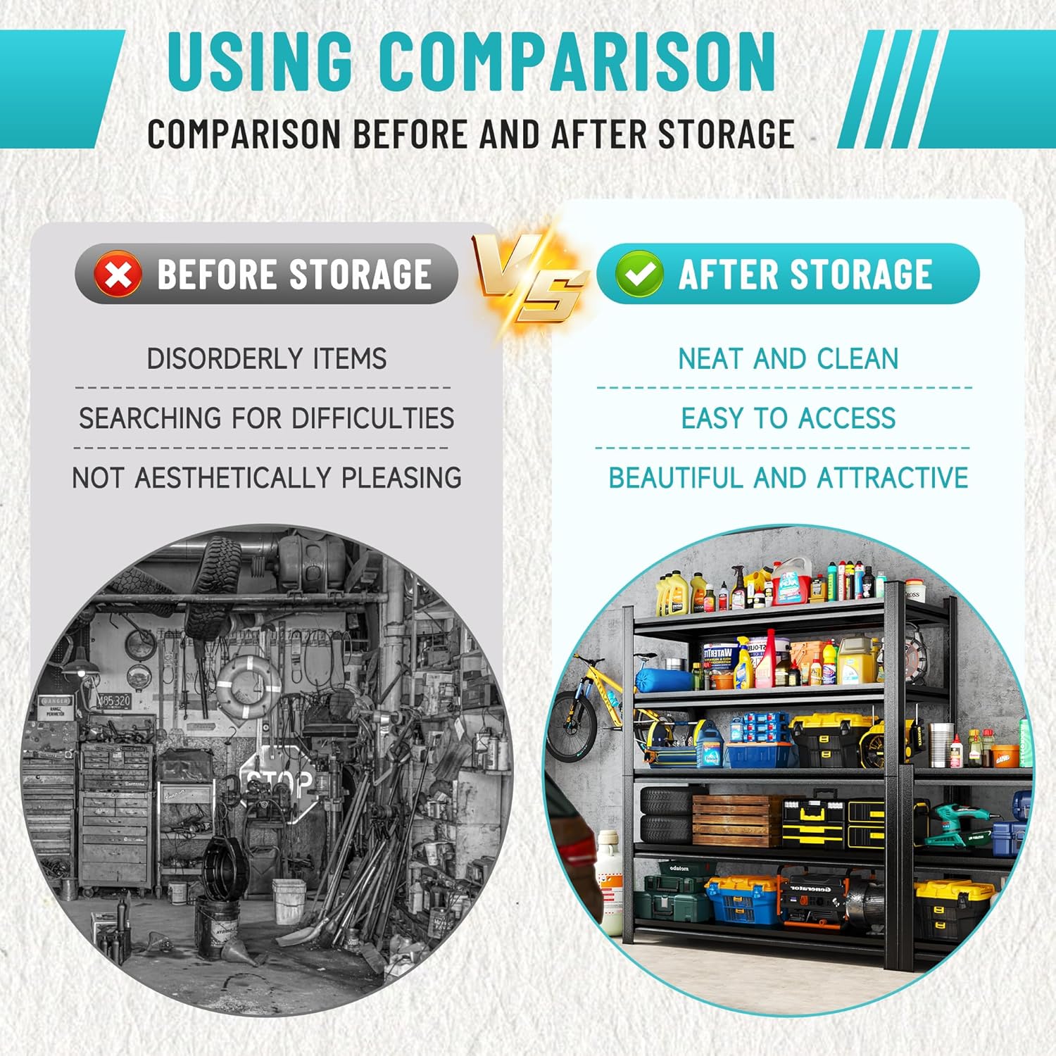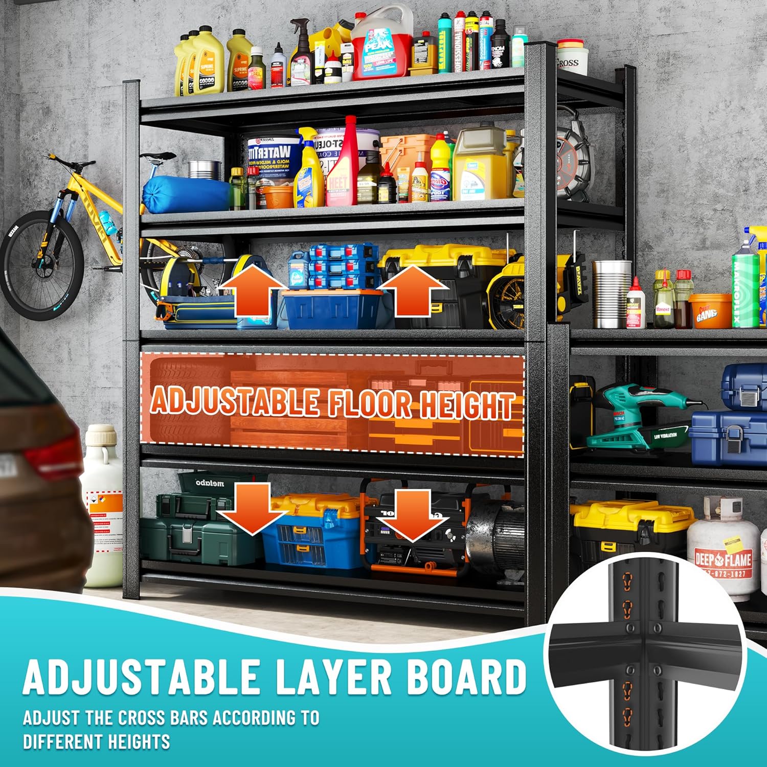 • 【Flexible Height Adjustment, Greatly Improve Space Utilization】This garage shelf can freely raise and lower the height of the five tiers of boards through the design of micro-adjustable slots, which can accurately match the different sizes of items from toolboxes and paint buckets to engines, containers and other items, and improves the utilization rate of each tier! The garage shelves are designed with tool-less adjustments, locking with the push of a finger, no need to remove bolts, and switching can be done in less than 30 seconds.