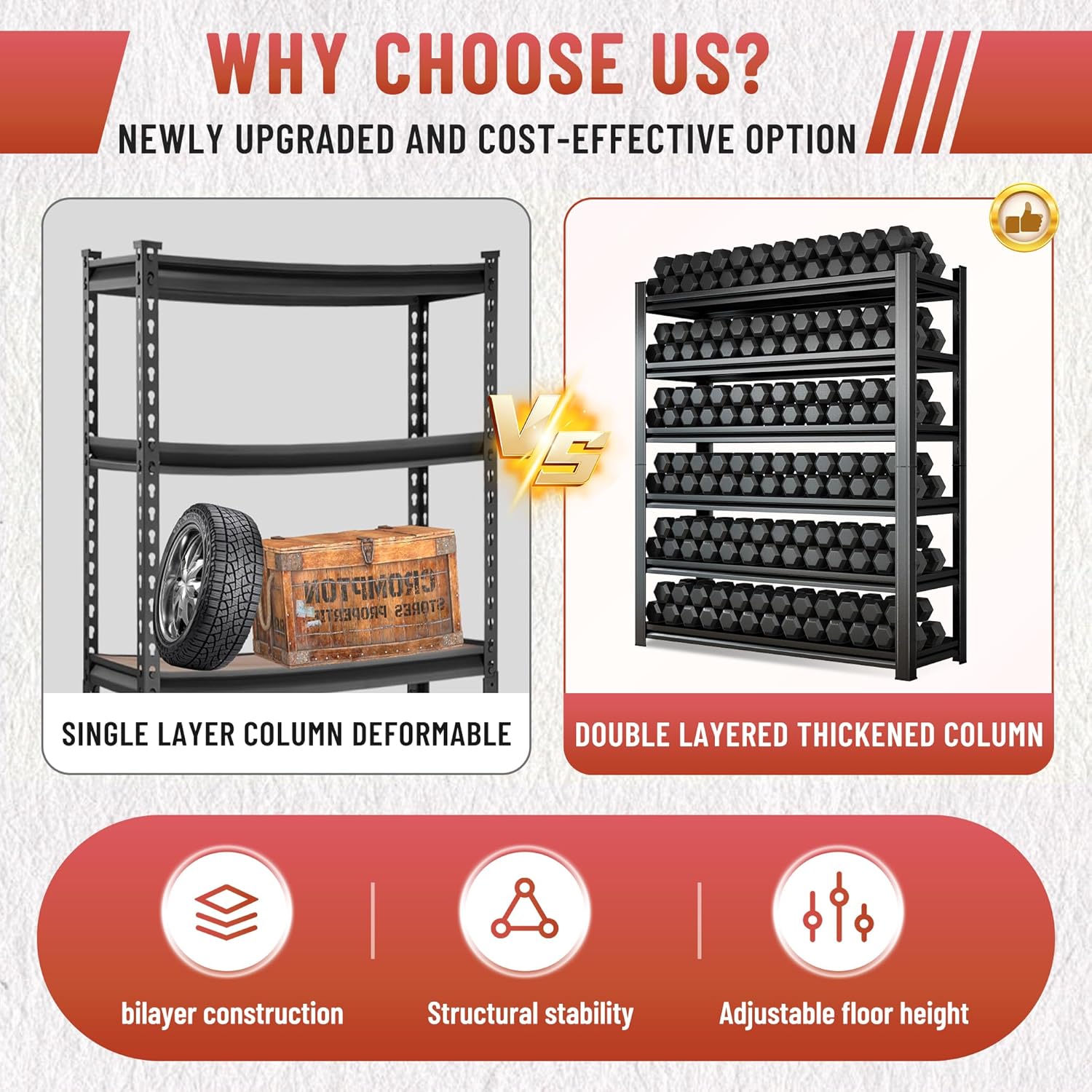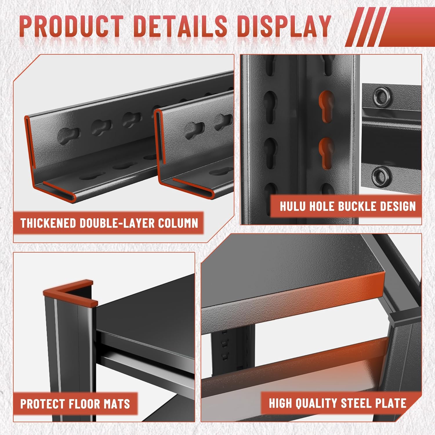 • 【Double-Thick Uprights for Enhanced Support】Featuring double-thick uprights, this shelving system provides superior reinforcement. The extra layer of strength guarantees that the Garage Shelving can handle heavy loads while maintaining its structural integrity